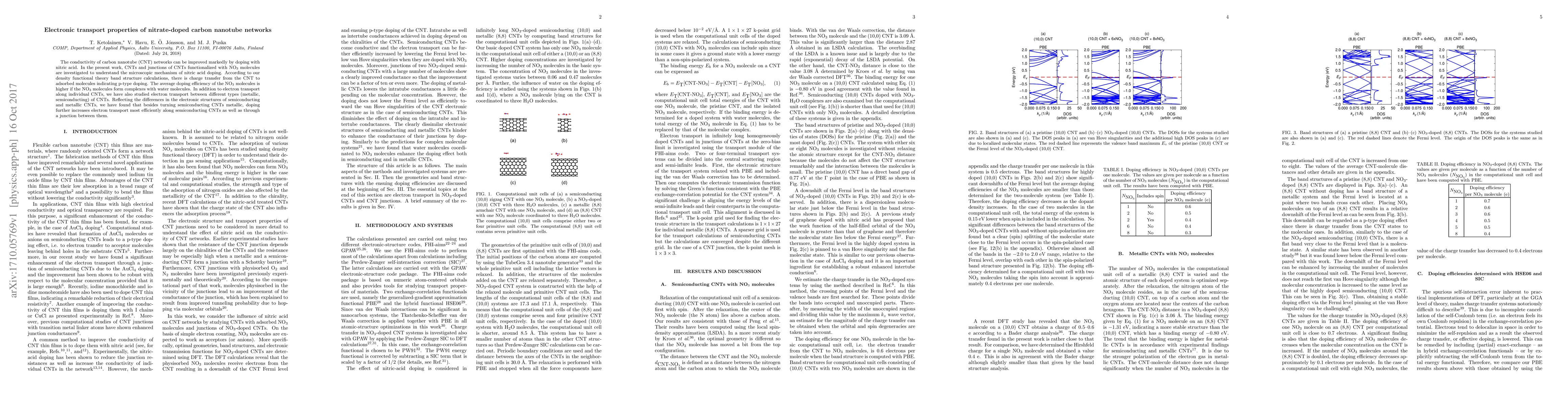 The conductivity of carbon nanotube (CNT) networks can be improved markedly by doping with nitric acid. In the present work, CNTs and junctions of CNTs functionalized with NO$_3$ molecules are investigated to understand the microscopic mechanism of nitric acid doping. According to our density functional theory band structure calculations, there is charge transfer from the CNT to adsorbed molecules indicating p-type doping. The average doping efficiency of the NO$_3$ molecules is higher if the NO$_3$ molecules form complexes with water molecules. In addition to electron transport along individual CNTs, we have also studied electron transport between different types (metallic, semiconducting) of CNTs. Reflecting the differences in the electronic structures of semiconducting and metallic CNTs, we have found that besides turning semiconducting CNTs metallic, doping further increases electron transport most efficiently along semiconducting CNTs as well as through a junction between them.