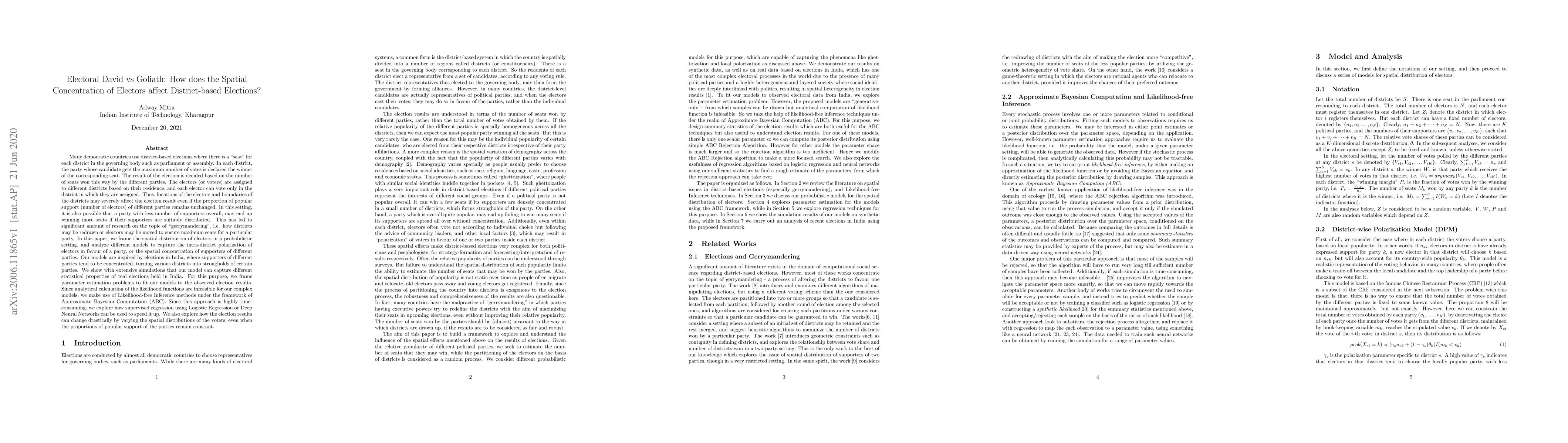 This paper explores how the spatial concentration of electors affects district-based elections, using probabilistic models to capture intra-district polarization and spatial concentration of party supporters. It demonstrates the models' effectiveness through simulations of Indian elections and employs Likelihood-free Inference methods for parameter estimation, supplemented by supervised regression techniques to expedite the process.