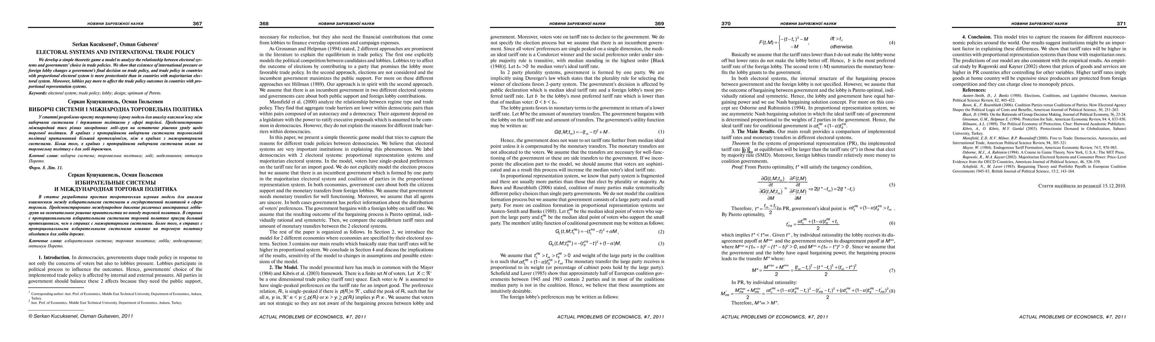 This paper constructs a theoretical model to examine how electoral systems influence government trade policy decisions, finding that countries with proportional representation tend to adopt more protectionist trade policies compared to those with majoritarian systems, especially when subject to international pressure or lobby influence.