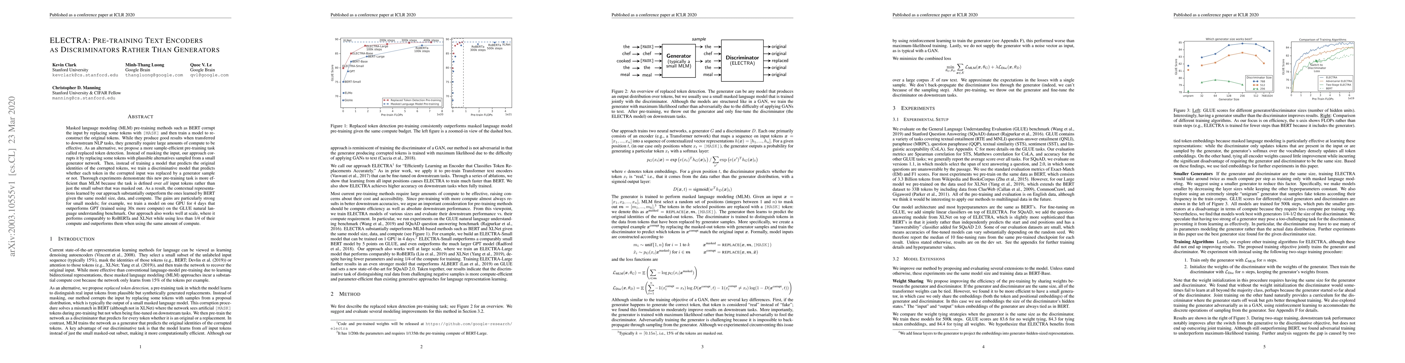 Masked language modeling (MLM) pre-training methods such as BERT corrupt the input by replacing some tokens with [MASK] and then train a model to reconstruct the original tokens. While they produce good results when transferred to downstream NLP tasks, they generally require large amounts of compute to be effective. As an alternative, we propose a more sample-efficient pre-training task called replaced token detection. Instead of masking the input, our approach corrupts it by replacing some tokens with plausible alternatives sampled from a small generator network. Then, instead of training a model that predicts the original identities of the corrupted tokens, we train a discriminative model that predicts whether each token in the corrupted input was replaced by a generator sample or not. Thorough experiments demonstrate this new pre-training task is more efficient than MLM because the task is defined over all input tokens rather than just the small subset that was masked out. As a result, the contextual representations learned by our approach substantially outperform the ones learned by BERT given the same model size, data, and compute. The gains are particularly strong for small models; for example, we train a model on one GPU for 4 days that outperforms GPT (trained using 30x more compute) on the GLUE natural language understanding benchmark. Our approach also works well at scale, where it performs comparably to RoBERTa and XLNet while using less than 1/4 of their compute and outperforms them when using the same amount of compute.