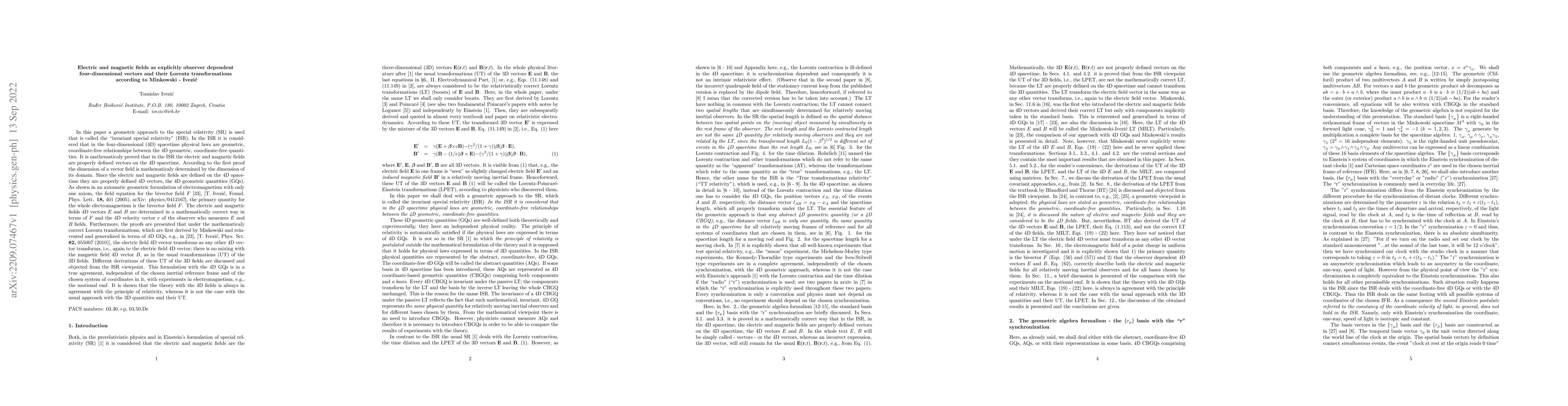 In this paper a geometric approach to the special relativity (SR) is used that is called the "invariant special relativity" (ISR). In the ISR it is considered that in the four-dimensional (4D) spacetime physical laws are geometric, coordinate-free relationships between the 4D geometric, coordinate-free quantities. It is mathematicaly proved that in the ISR the electric and magnetic fields are properly defined vectors on the 4D spacetime. According to the first proof the dimension of a vector field is mathematicaly determined by the dimension of its domain. Since the electric and magnetic fields are defined on the 4D spacetime they are properly defined 4D vectors, the 4D geometric quantities (GQs). As shown in an axiomatic geometric formulation of electromagnetism with only one axiom, the field equation for the bivector field F [33], [T. Ivezi\'c, Found. Phys. Lett. 18, 401 (2005), arXiv: physics/0412167], the primary quantity for the whole electromagnetism is the bivector field F. The electric and magnetic fields 4D vectors E and B are determined in a mathematically correct way in terms of F and the 4D velocity vector v of the observer who measures E and B fields. Furthermore, the proofs are presented that under the mathematicaly correct Lorentz transformations, which are first derived by Minkowski and reinvented and generalized in terms of 4D GQs, e.g., in [23], [T. Ivezi\'c, Phys. Scr. 82, 055007 (2010)], the electric field 4D vector transforms as any other 4D vector transforms, i.e., again to the electric field 4D vector; there is no mixing with the magnetic field 4D vector B, as in the usual transformations (UT) of the 3D fields. This formulation with the 4D GQs is in a true agreement with experiments in electromagnetism, e.g., the motional emf.