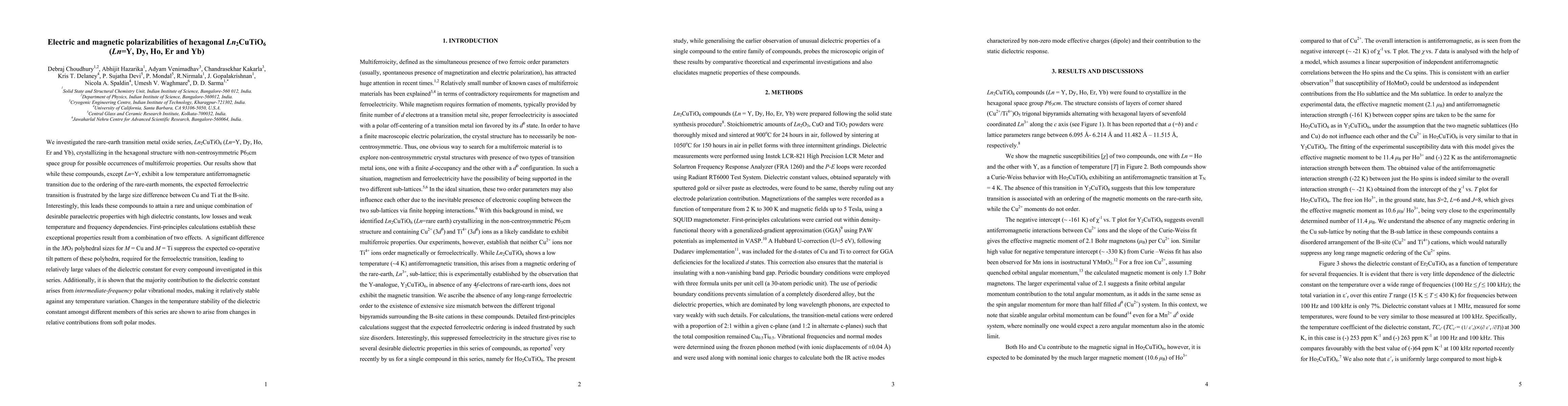 We investigated the rare-earth transition metal oxide series, Ln2CuTiO6 (Ln=Y, Dy, Ho, Er and Yb), crystallizing in the hexagonal structure with non-centrosymmetric P63cm space group for possible occurrences of multiferroic properties. Our results show that while these compounds, except Ln=Y, exhibit a low temperature antiferromagnetic transition due to the ordering of the rare-earth moments, the expected ferroelectric transition is frustrated by the large size difference between Cu and Ti at the B-site. Interestingly, this leads these compounds to attain a rare and unique combination of desirable paraelectric properties with high dielectric constants, low losses and weak temperature and frequency dependencies. First-principles calculations establish these exceptional properties result from a combination of two effects. A significant difference in the MO5 polyhedral sizes for M = Cu and M = Ti suppress the expected co-operative tilt pattern of these polyhedra, required for the ferroelectric transition, leading to relatively large values of the dielectric constant for every compound investigated in this series. Additionally, it is shown that the majority contribution to the dielectric constant arises from intermediate-frequency polar vibrational modes, making it relatively stable against any temperature variation. Changes in the temperature stability of the dielectric constant amongst different members of this series are shown to arise from changes in relative contributions from soft polar modes.