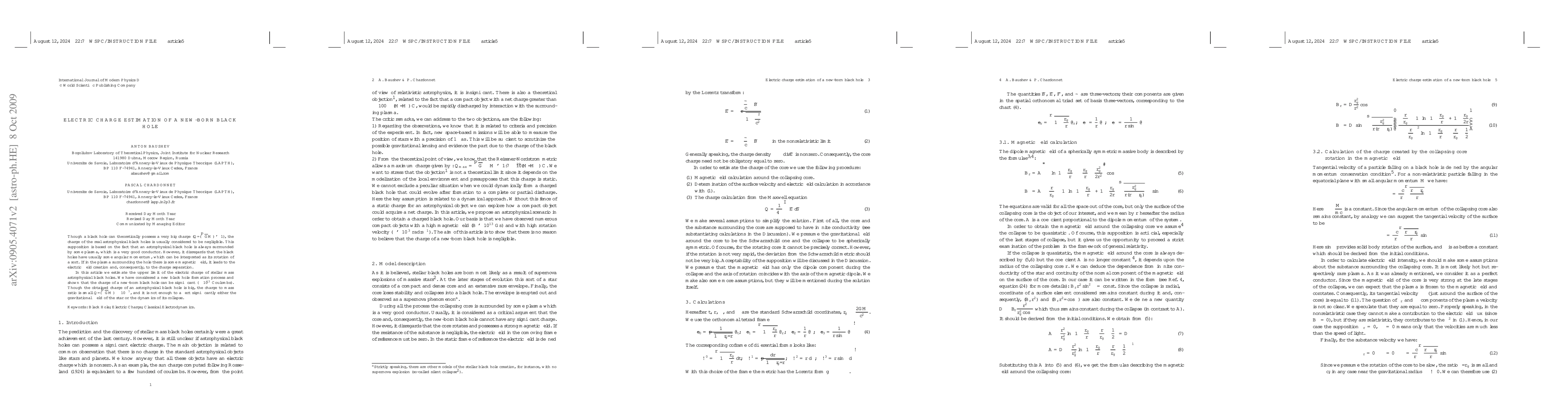 This paper estimates the upper limit of electric charge in newly formed stellar mass black holes, suggesting that they can possess significant charge ($\sim 10^{13}$ Coulombs) due to magnetic fields in surrounding plasma. Despite this, the charge-to-mass ratio is small ($Q/(\sqrt{G} M) \sim 10^{-7}$), implying minimal impact on gravitational or collapse dynamics.
