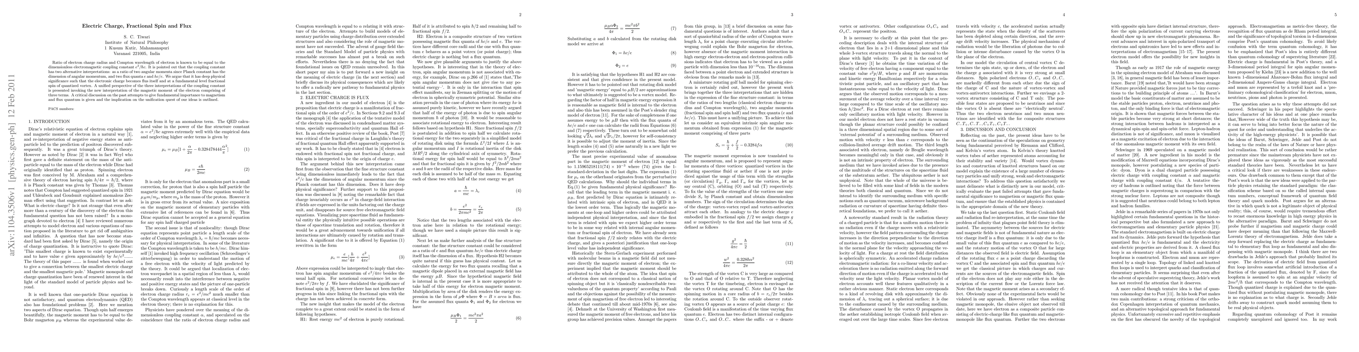 Ratio of electron charge radius and Compton wavelength of electron is known to be equal to the dimensionless electromagnetic coupling constant $e^2 /\hbar c$. It is pointed out that the coupling constant has two alternative interpretations: as a ratio of two angular momenta since Planck constant has the dimension of angular momentum, and two flux quanta $e$ and $hc/e$. We argue that it has deep physical significance such that the electronic charge becomes flus itself and at a fundamental level fractional spin of quantized vortex. A unified perspective of the three interpretations of the coupling constant is presented invoking the new interpretation of the magnetic moment of the electron comprising of three terms. A critical discussion on the past attempts to give fundamental importance to magnetism and flux quantum is given and the implication on the unification quest of our ideas is outlined.