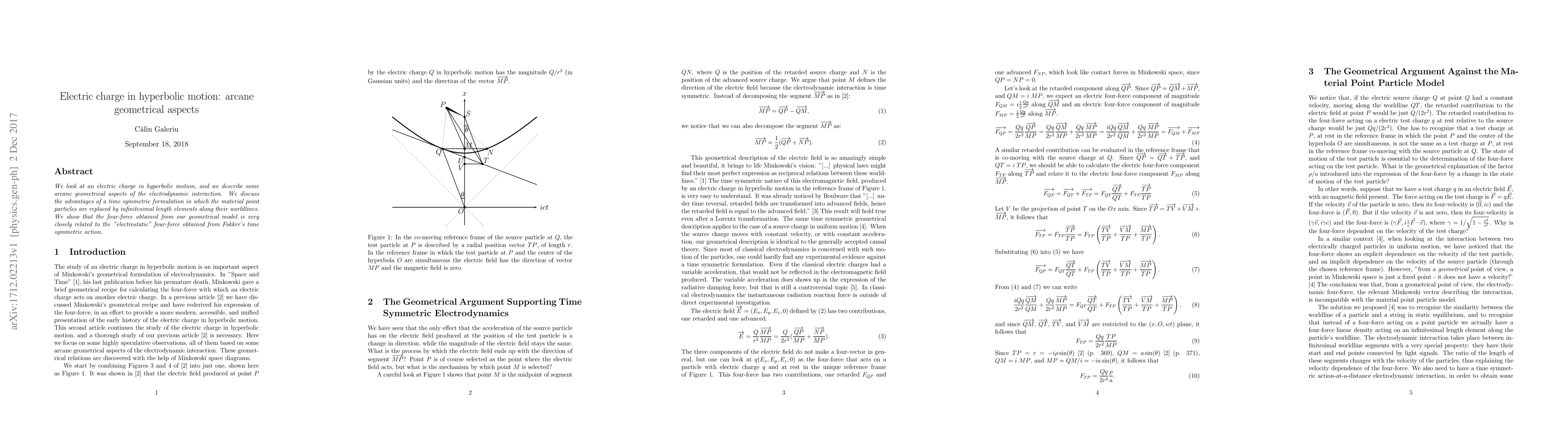 We look at an electric charge in hyperbolic motion, and we describe some arcane geometrical aspects of the electrodynamic interaction. We discuss the advantages of a time symmetric formulation in which the material point particles are replaced by infinitesimal length elements along their worldlines. We show that the four-force obtained from our geometrical model is very closely related to the "electrostatic" four-force obtained from Fokker's time symmetric action.