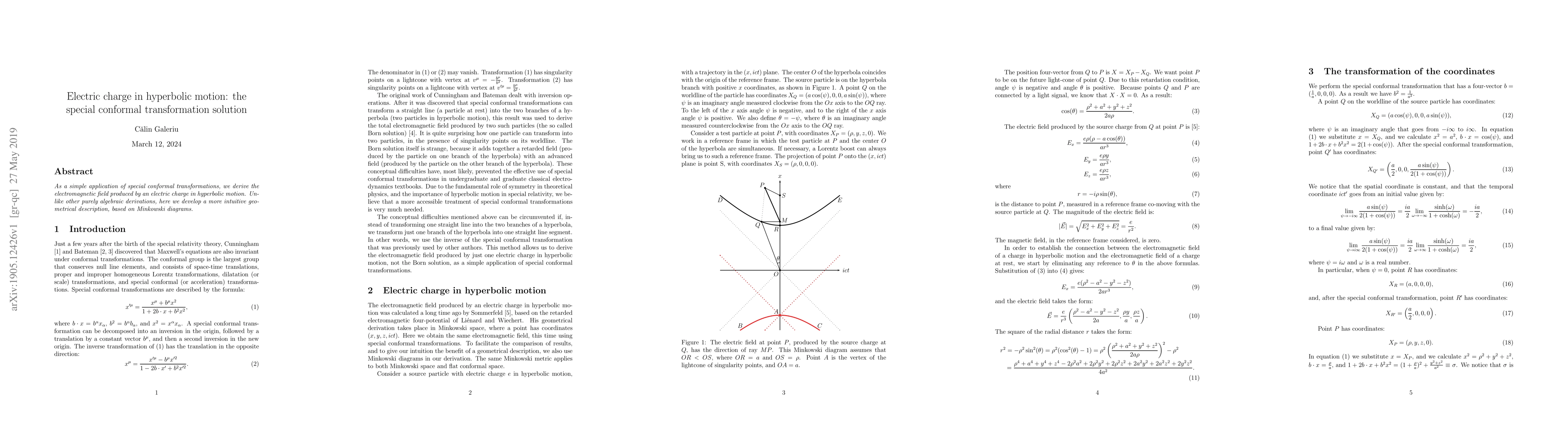 Summary: This paper derives the electromagnetic field of an electric charge in hyperbolic motion using special conformal transformations, offering a geometrical interpretation through Minkowski diagrams instead of purely algebraic methods.