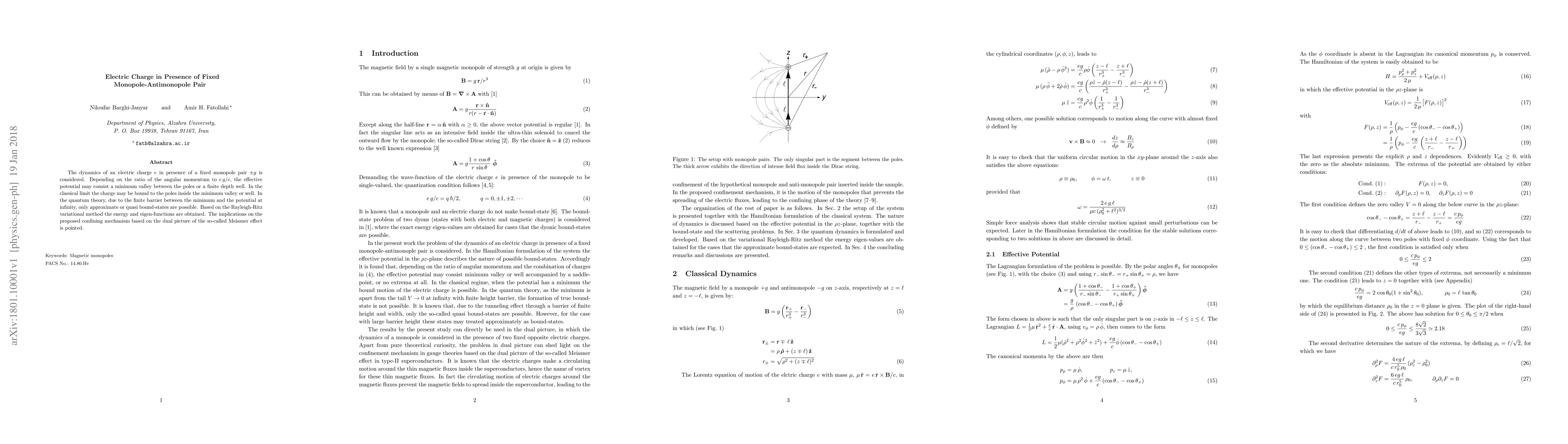 The dynamics of an electric charge $e$ in presence of a fixed monopole pair $\pm g$ is considered. Depending on the ratio of the angular momentum to $e\,g/c$, the effective potential may consist a minimum valley between the poles or a finite depth well. In the classical limit the charge may be bound to the poles inside the minimum valley or well. In the quantum theory, due to the finite barrier between the minimum and the potential at infinity, only approximate or quasi bound-states are possible. Based on the Rayleigh-Ritz variational method the energy and eigen-functions are obtained. The implications on the proposed confining mechanism based on the dual picture of the so-called Meissner effect is pointed.