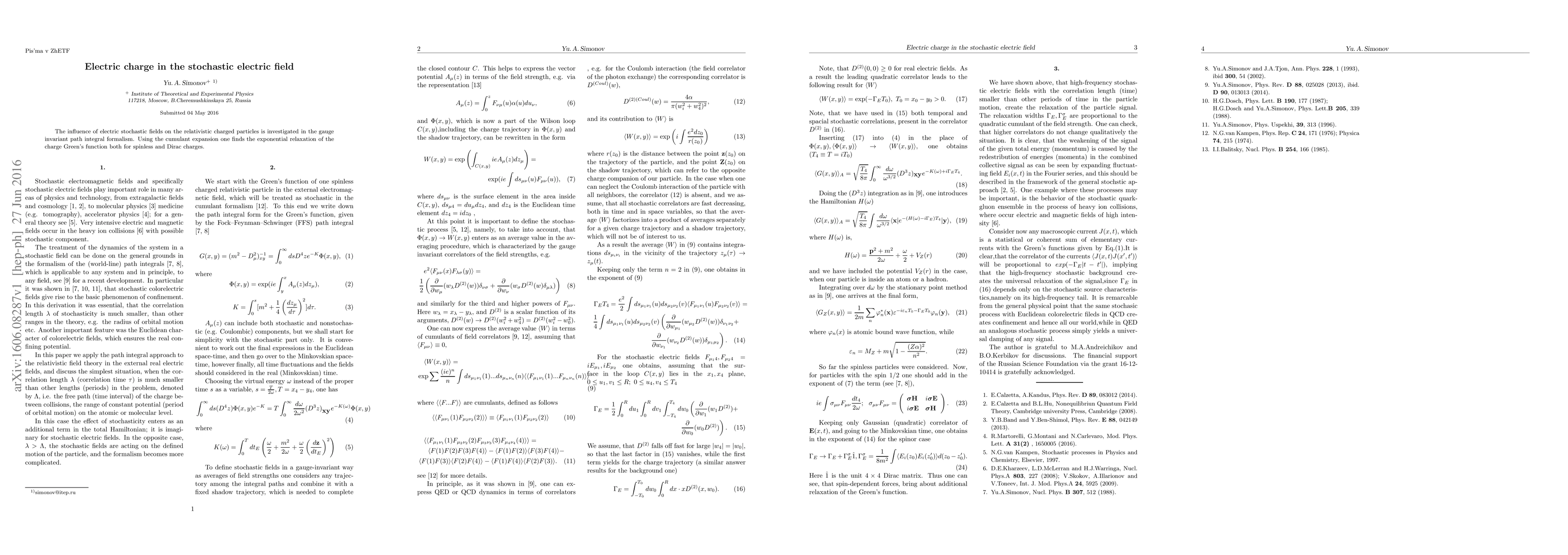 The influence of electric stochastic fields on the relativistic charged particles is investigated in the gauge invariant path integral formalism. Using the cumulant expansion one finds the exponential relaxation of the charge Green's function both for spinless and Dirac charges.