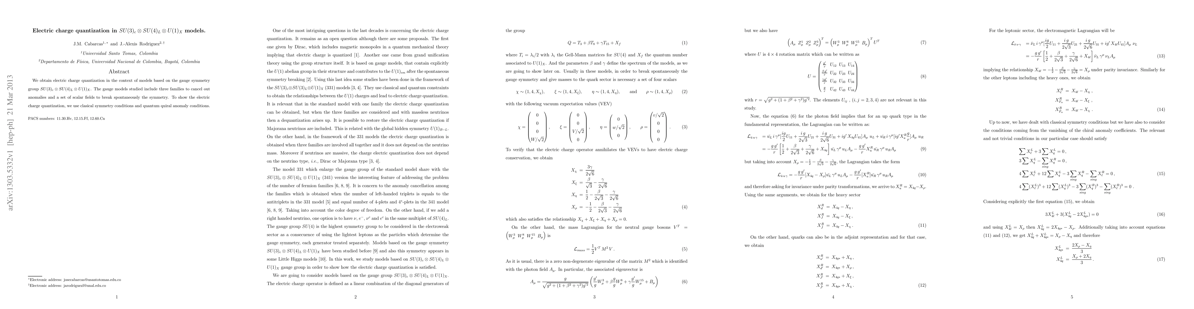 This paper explores electric charge quantization within gauge symmetry models based on SU(3) X SU(4) X U(1), employing three families and scalar fields for symmetry breaking. It demonstrates charge quantization through classical symmetry and quantum chiral anomaly conditions.