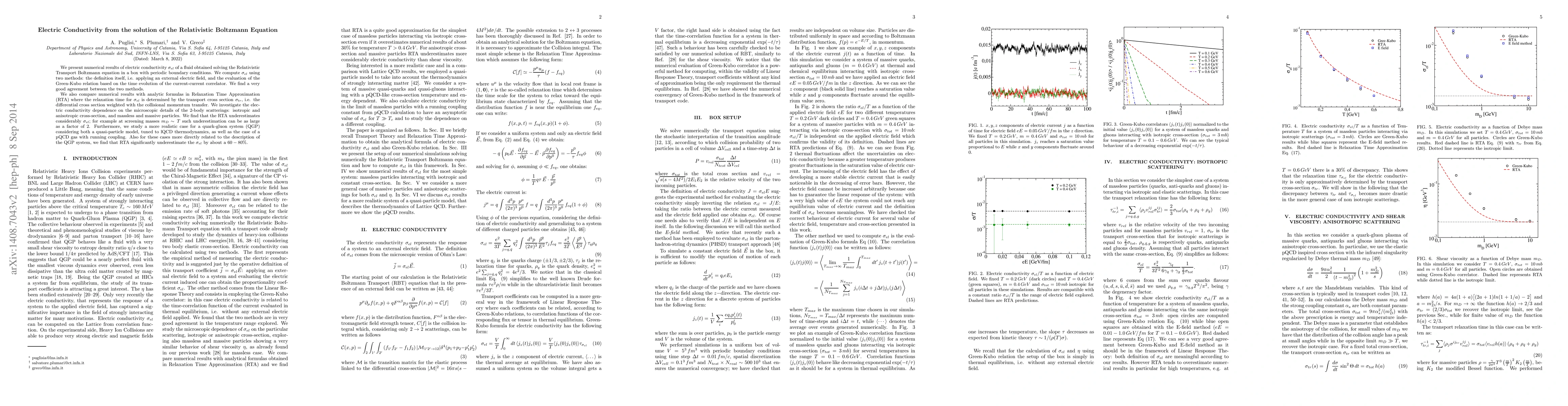 We present numerical results of electric conductivity $\sigma_{el}$ of a fluid obtained solving the Relativistic Transport Boltzmann equation in a box with periodic boundary conditions. We compute $\sigma_{el}$ using two methods: the definition itself, i.e. applying an external electric field, and the evaluation of the Green-Kubo relation based on the time evolution of the current-current correlator. We find a very good agreement between the two methods. We also compare numerical results with analytic formulas in Relaxation Time Approximation (RTA) where the relaxation time for $\sigma_{el}$ is determined by the transport cross section $\sigma_{tr}$, i.e. the differential cross section weighted with the collisional momentum transfer. We investigate the electric conductivity dependence on the microscopic details of the 2-body scatterings: isotropic and anisotropic cross-section, and massless and massive particles. We find that the RTA underestimates considerably $\sigma_{el}$; for example at screening masses $m_D \sim \,T$ such underestimation can be as large as a factor of 2. Furthermore, we study a more realistic case for a quark-gluon system (QGP) considering both a quasi-particle model, tuned to lQCD thermodynamics, as well as the case of a pQCD gas with running coupling. Also for these cases more directly related to the description of the QGP system, we find that RTA significantly underestimate the $\sigma_{el}$ by about a $60-80\%$.