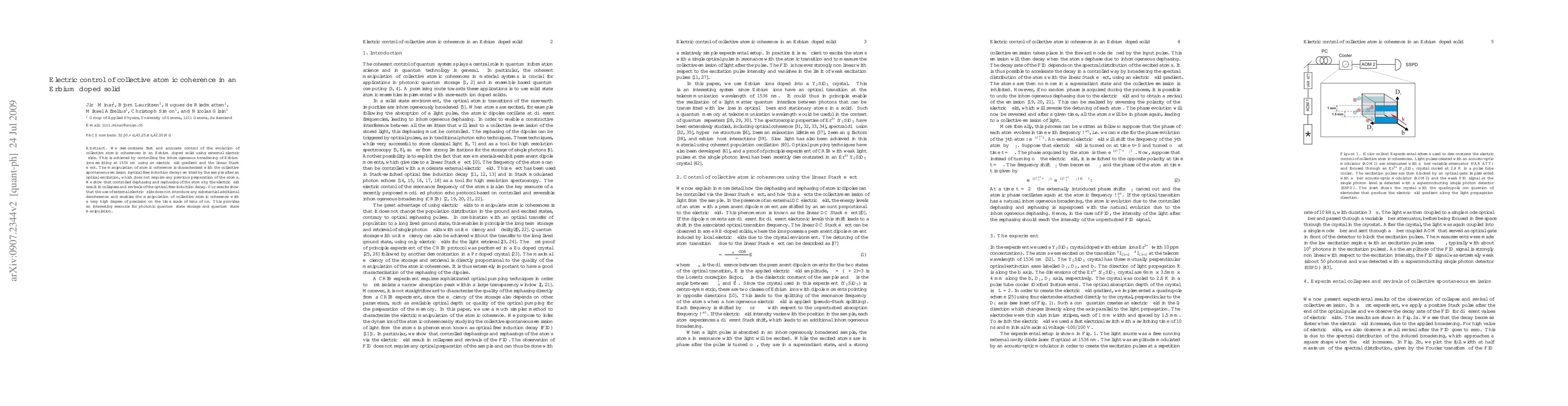 This paper demonstrates precise control over collective atomic coherence in an Erbium-doped solid via external electric fields, achieving manipulation through the linear Stark effect without introducing significant decoherence. The method enables collapses and revivals of optical free induction decay, offering potential for photonic quantum state storage and manipulation.