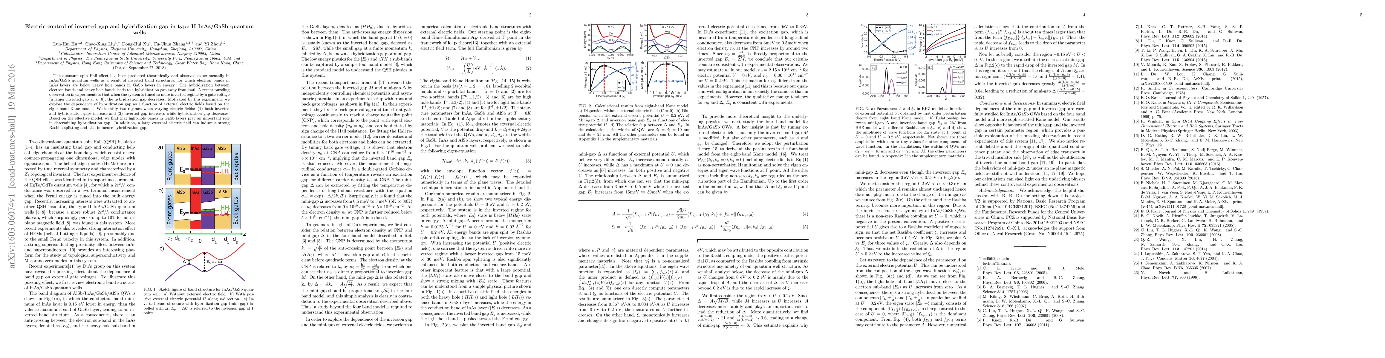 This paper investigates the electric field dependence of the hybridization gap in InAs/GaSb quantum wells, revealing two regimes: one where both gaps increase and another where the inversion gap rises while the hybridization gap decreases. The study highlights the role of light-hole bands and Rashba splitting in these phenomena.