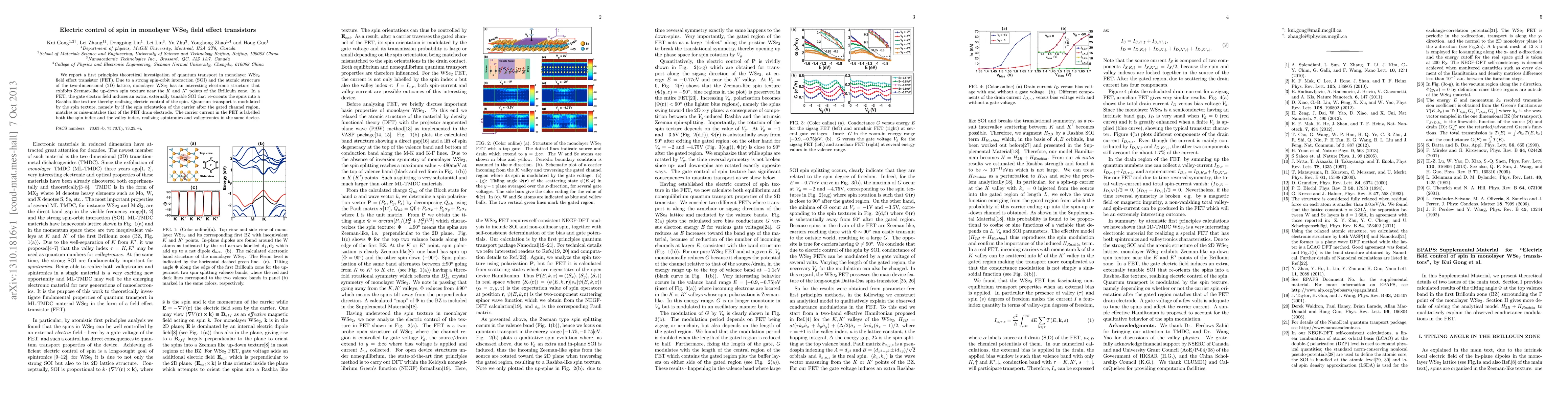 This research investigates monolayer WSe2 field effect transistors, demonstrating electric control of spin via tunable spin-orbit interaction induced by gate electric fields. The study shows that the device can achieve both spintronics and valleytronics through spin orientation modulation.