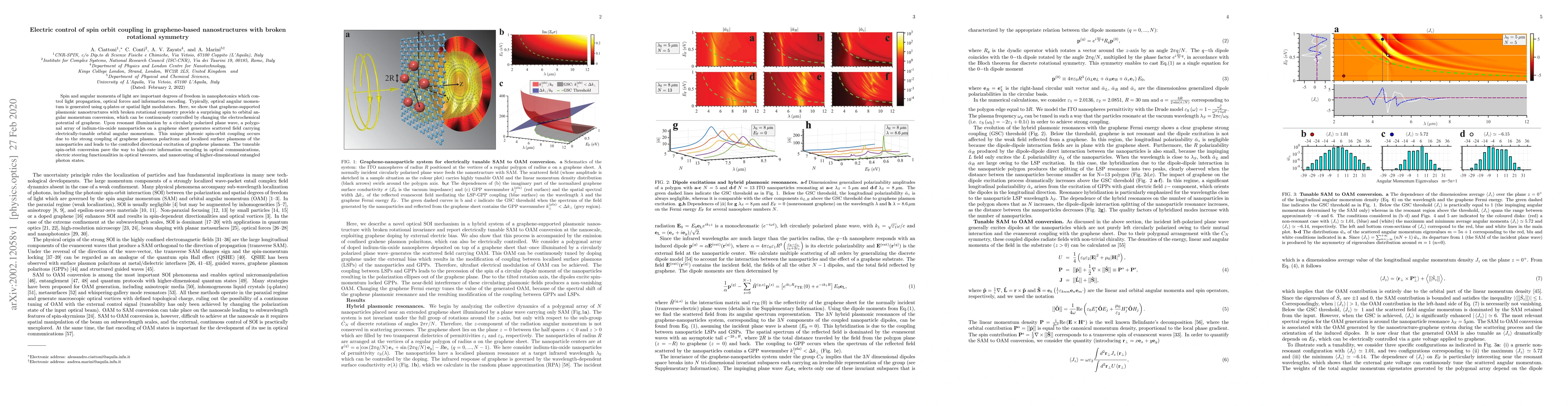 This paper demonstrates that graphene-supported plasmonic nanostructures with broken rotational symmetry enable electric control of spin-orbit coupling, converting spin to orbital angular momentum. This conversion is tunable via graphene's electrochemical potential, paving the way for advanced applications in optical communications and nanophotonics.