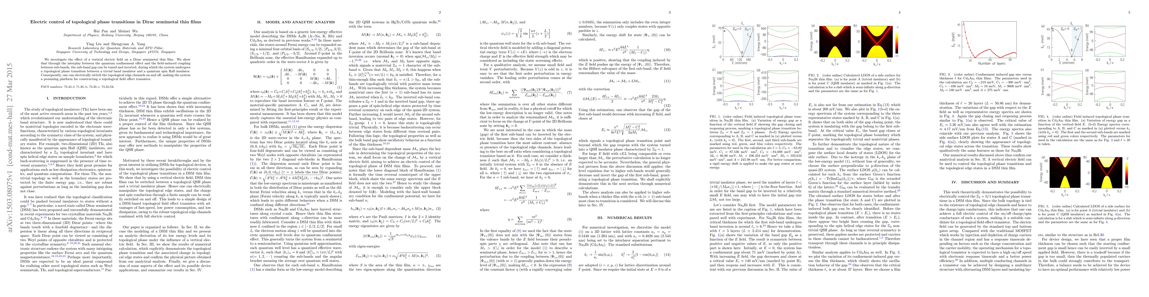 This paper demonstrates that a vertical electric field can electrically control topological phase transitions in Dirac semimetal thin films, enabling the tuning and inversion of the sub-band gap, and thus switching topological edge channels on and off, which presents a potential for topological field effect transistors.