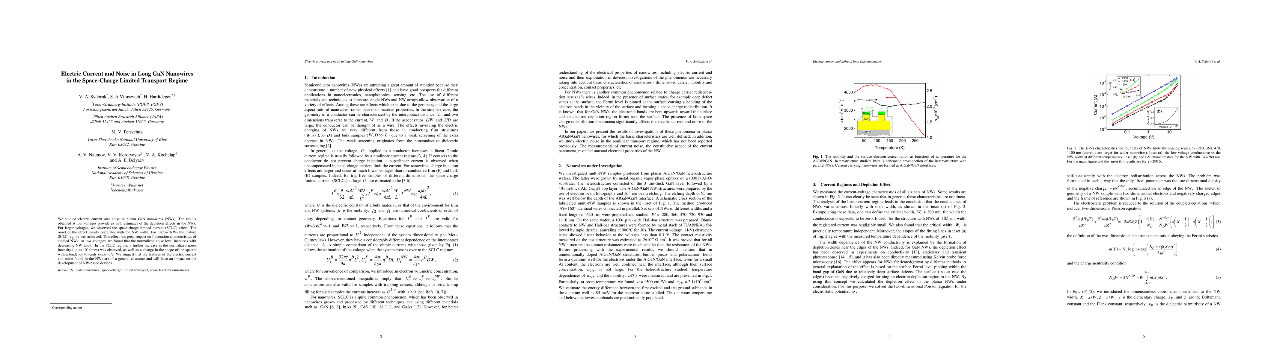 This study investigates electric current and noise in GaN nanowires under low and high voltages, revealing depletion effects and space-charge limited current (SCLC) regimes. The SCLC significantly increases noise intensity, especially in narrow nanowires, suggesting broad implications for future NW-based device development.