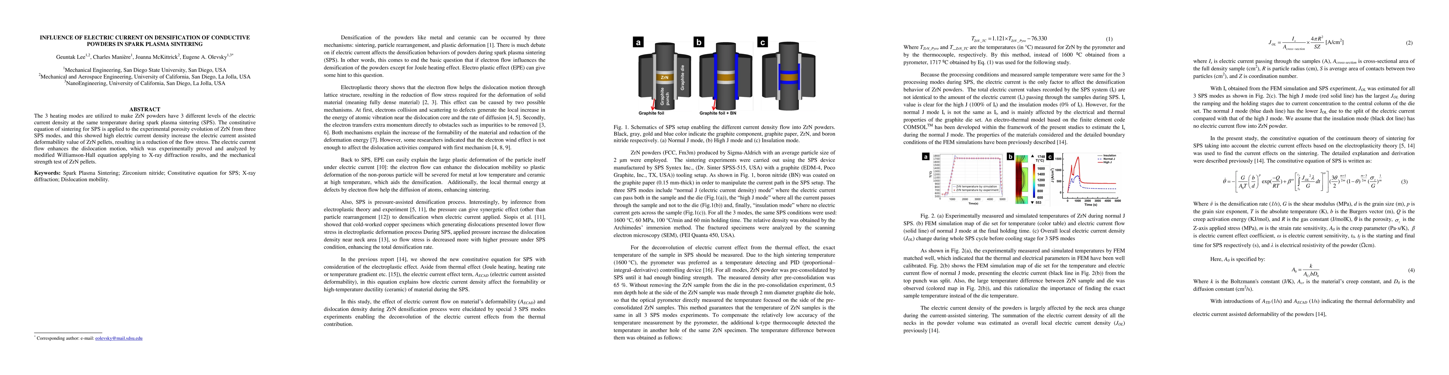 The 3 heating modes are utilized to make ZrN powders have 3 different levels of the electric current density at the same temperature during spark plasma sintering (SPS). The constitutive equation of sintering for SPS is applied to the experimental porosity evolution of ZrN from three SPS modes, and this showed high electric current density increase the electric current assisted deformability value of ZrN pellets, resulting in a reduction of the flow stress. The electric current flow enhances the dislocation motion, which was experimentally proved and analyzed by modified Williamson-Hall equation applying to X-ray diffraction results, and the mechanical strength test of ZrN pellets.