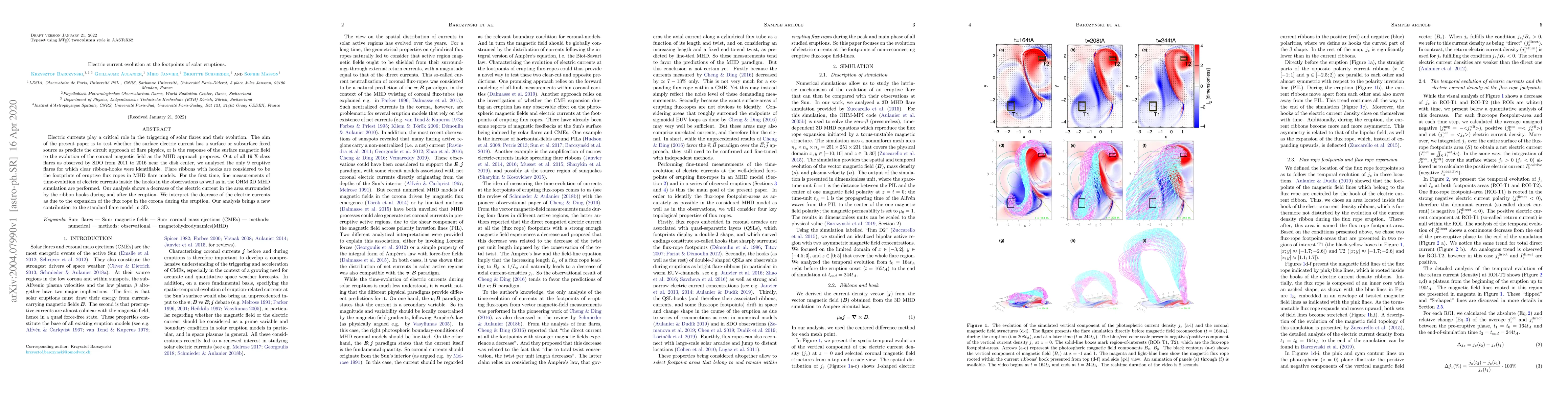 Research investigates electric currents during solar eruptions, finding a decrease in current near 'ribbon hooks' formed by eruptive flux ropes, suggesting these structures may cause the observed decrease.