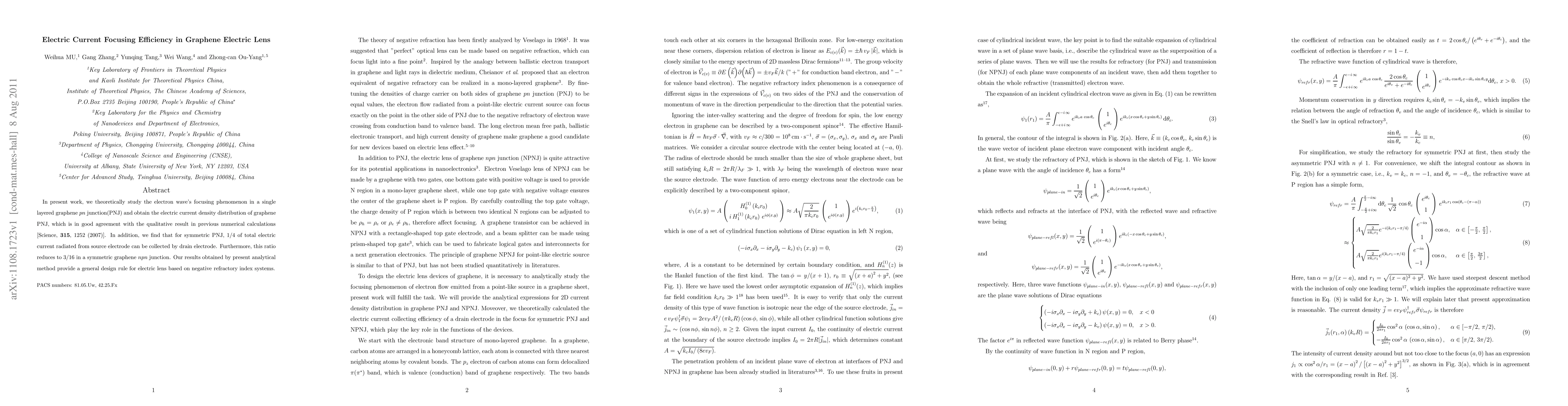 In present work, we theoretically study the electron wave's focusing phenomenon in a single layered graphene pn junction(PNJ) and obtain the electric current density distribution of graphene PNJ, which is in good agreement with the qualitative result in previous numerical calculations [Science, 315, 1252 (2007)]. In addition, we find that for symmetric PNJ, 1/4 of total electric current radiated from source electrode can be collected by drain electrode. Furthermore, this ratio reduces to 3/16 in a symmetric graphene npn junction. Our results obtained by present analytical method provide a general design rule for electric lens based on negative refractory index systems.