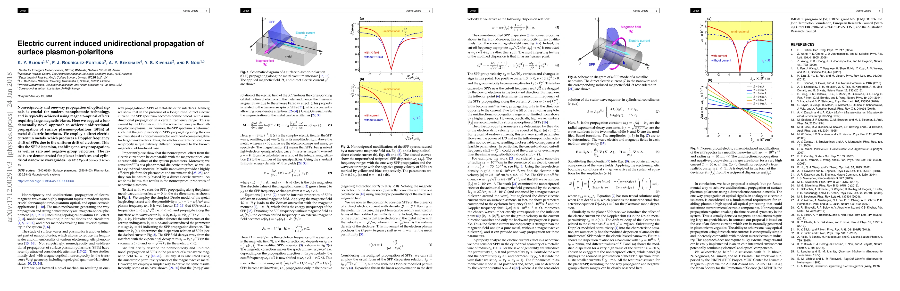 This paper proposes a novel method to achieve unidirectional propagation of surface plasmon-polaritons using a direct electric current in metals, which induces a Doppler frequency shift and tilts the SPP dispersion for one-way propagation. This approach eliminates the need for large magnetic biases typically required for nonreciprocity in nanophotonic technology.