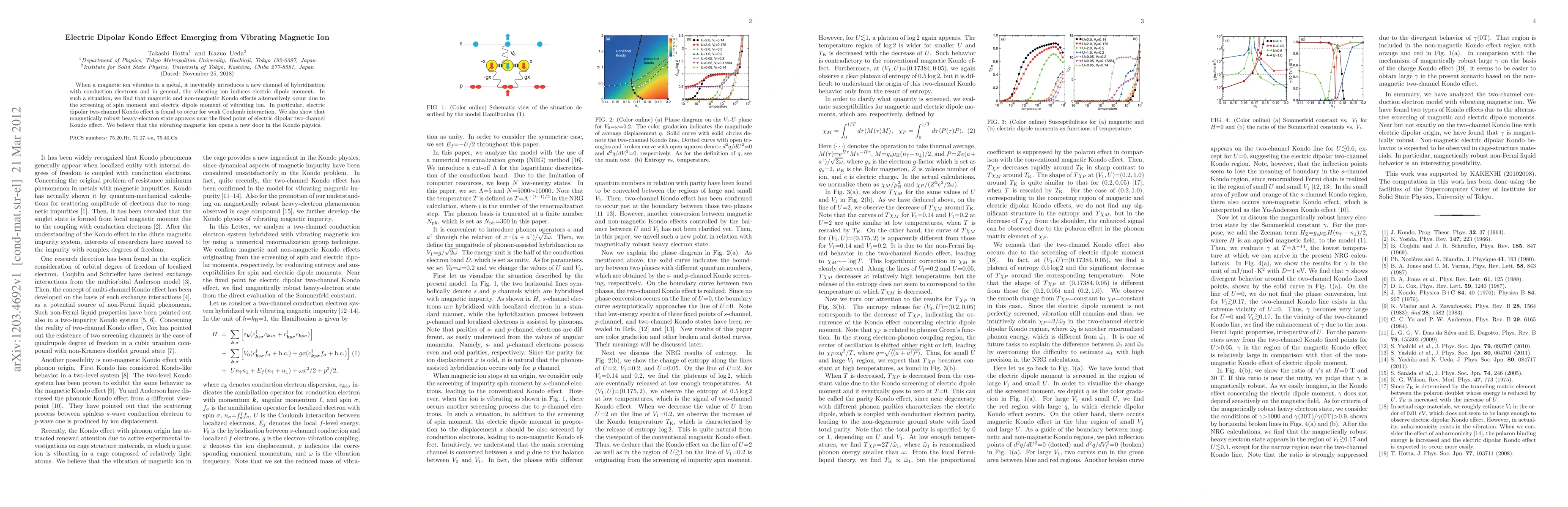 When a magnetic ion vibrates in a metal, it inevitably introduces a new channel of hybridization with conduction electrons and in general, the vibrating ion induces electric dipole moment. In such a situation, we find that magnetic and non-magnetic Kondo effects alternatively occur due to the screening of spin moment and electric dipole moment of vibrating ion. In particular, electric dipolar two-channel Kondo effect is found to occur for weak Coulomb interaction. We also show that magnetically robust heavy-electron state appears near the fixed point of electric dipolar two-channel Kondo effect. We believe that the {\it vibrating} magnetic ion opens a new door in the Kondo physics.