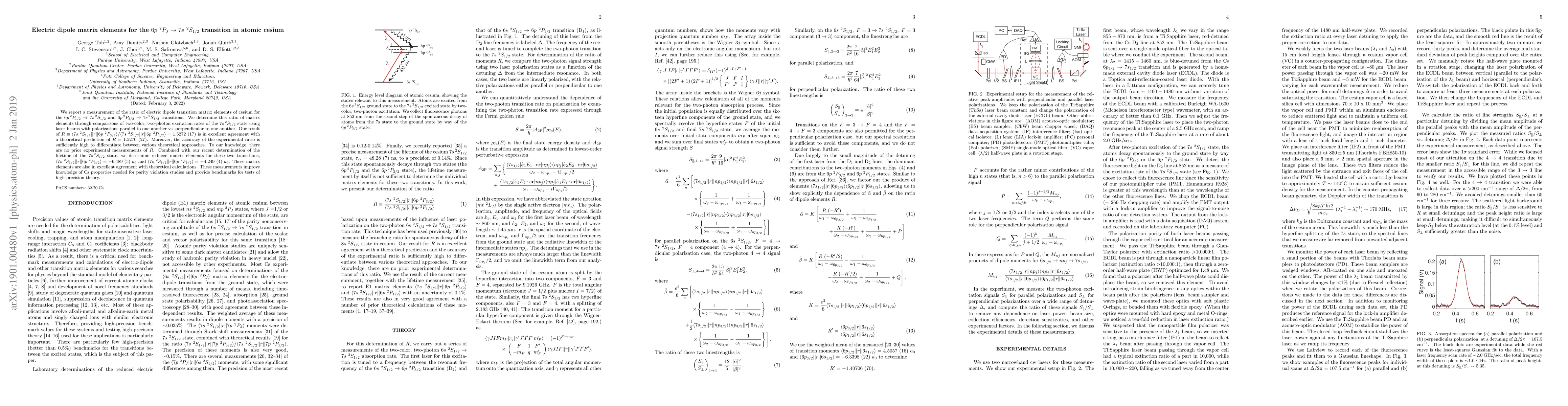 We report a measurement of the ratio of electric dipole transition matrix elements of cesium for the $6p\,^2P_{1/2} \rightarrow 7s\,^2S_{1/2}$ and $6p\,^2P_{3/2} \rightarrow 7s\,^2S_{1/2}$ transitions. We determine this ratio of matrix elements through comparisons of two-color, two-photon excitation rates of the $7s\,^2S_{1/2}$ state using laser beams with polarizations parallel to one another vs.\ perpendicular to one another. Our result of $R \equiv \langle 7s\ ^2S_{1/2} || r || 6p\ ^2P_{3/2} \rangle / \langle 7s\ ^2S_{1/2} || r || 6p\ ^2P_{1/2} \rangle = 1.5272 \ (17)$ is in excellent agreement with a theoretical prediction of $R=1.5270 \ (27)$. Moreover, the accuracy of the experimental ratio is sufficiently high to differentiate between various theoretical approaches. To our knowledge, there are no prior experimental measurements of $R$. Combined with our recent determination of the lifetime of the $7s\,^2S_{1/2}$ state, we determine reduced matrix elements for these two transitions, $\langle 7s\ ^2S_{1/2} || r || 6p\ ^2P_{3/2} \rangle = -6.489 \ (5) \ a_0$ and $\langle 7s\ ^2S_{1/2} || r || 6p\ ^2P_{1/2} \rangle = -4.249 \ (4) \ a_0$. These matrix elements are also in excellent agreement with theoretical calculations. These measurements improve knowledge of Cs properties needed for parity violation studies and provide benchmarks for tests of high-precision theory.