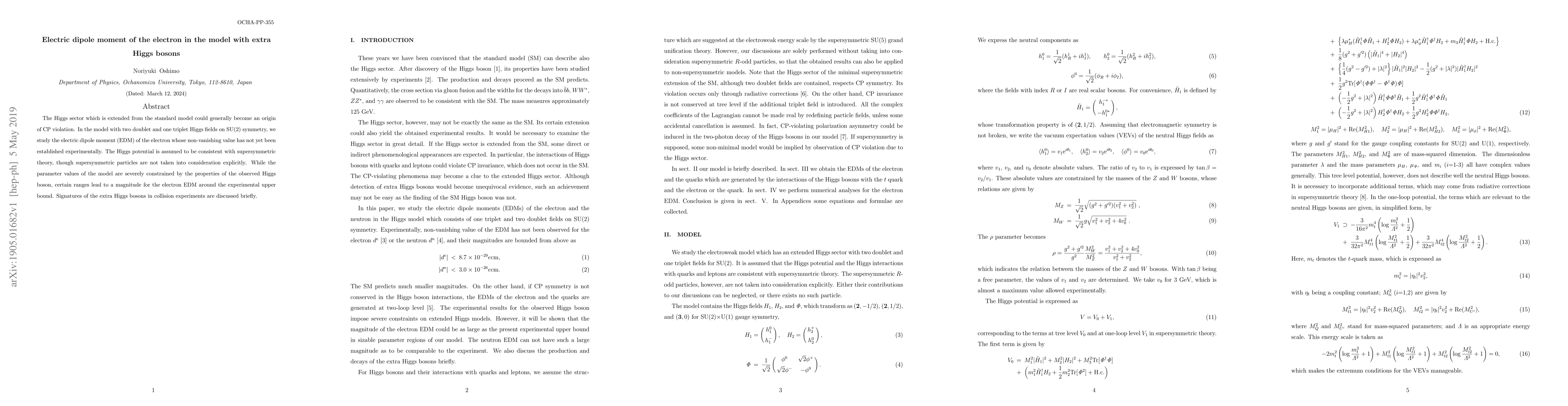The Higgs sector which is extended from the standard model could generally become an origin of CP violation. In the model with two doublet and one triplet Higgs fields on SU(2) symmetry, we study the electric dipole moment (EDM) of the electron whose non-vanishing value has not yet been established experimentally. The Higgs potential is assumed to be consistent with supersymmetric theory, though supersymmetric particles are not taken into consideration explicitly. While the parameter values of the model are severely constrained by the properties of the observed Higgs boson, certain ranges lead to a magnitude for the electron EDM around the experimental upper bound. Signatures of the extra Higgs bosons in collision experiments are discussed briefly.