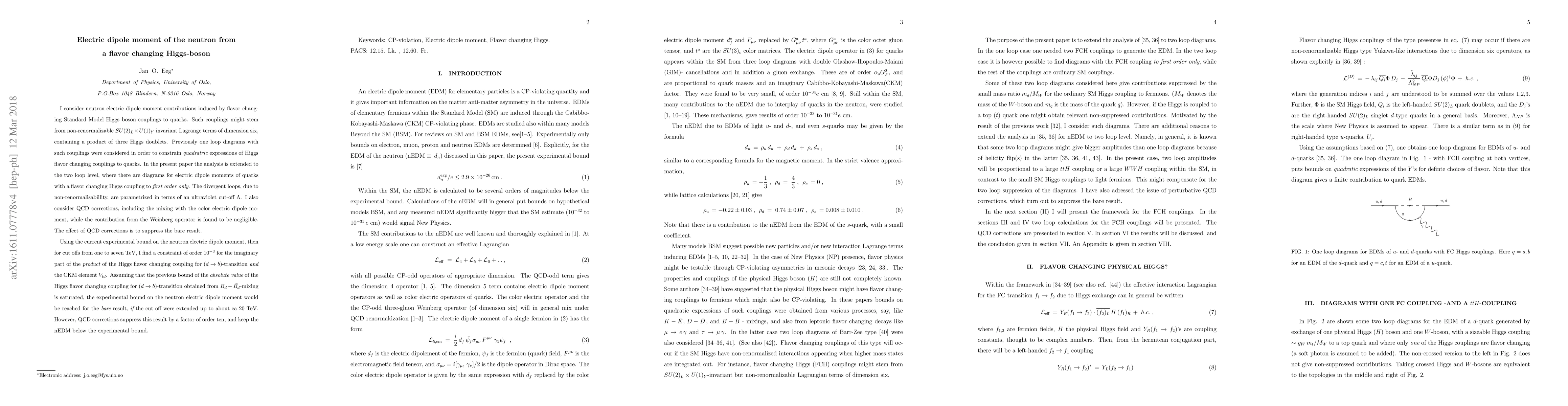 This paper investigates neutron electric dipole moment contributions from flavor-changing Higgs boson couplings to quarks, considering two-loop diagrams and non-renormalizable terms. It finds that QCD corrections significantly suppress the bare result, leading to a constraint on the Higgs coupling of order $10^{-3}$ for certain transitions.