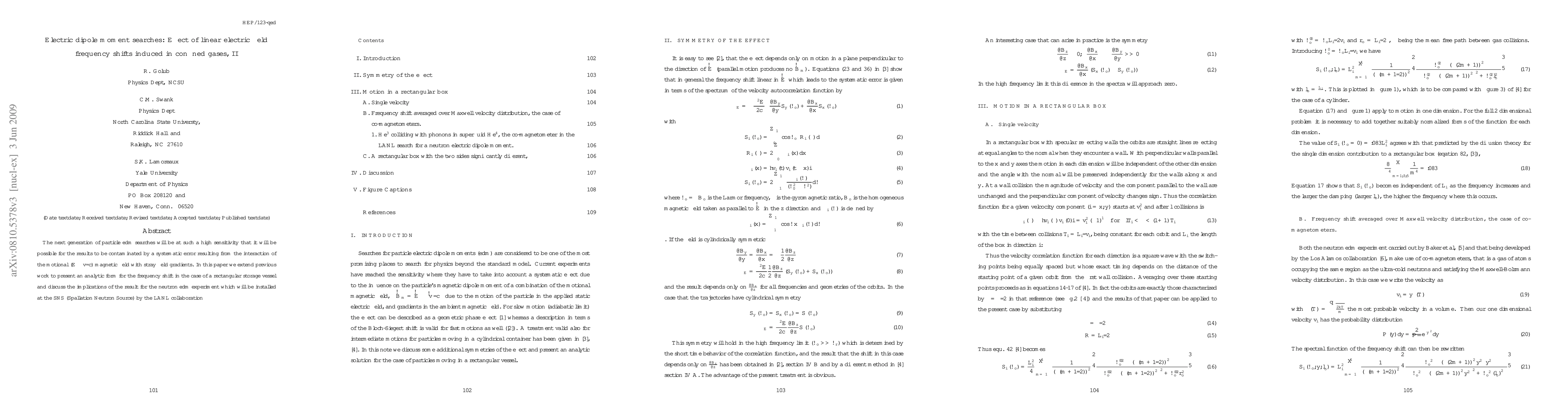 The next generation of particle edm searches will be at such a high sensitivity that it will be possible for the results to be contaminated by a systematic error resulting from the interaction of the motional (E x v/c) magnetic field with stray field gradients. In this paper we extend previous work to present an analytic form for the frequency shift in the case of a rectangular storage vessel and discuss the implications of the result for the neutron edm experiment which will be installed at the SNS (Spallation Neutron Source) by the LANL collaboration