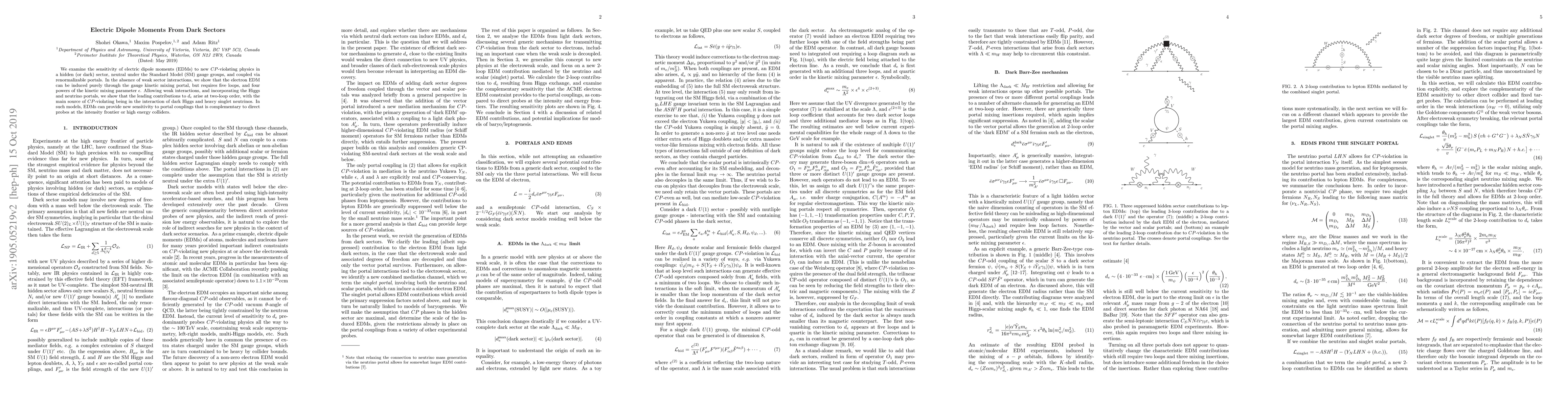 We examine the sensitivity of electric dipole moments (EDMs) to new $CP$-violating physics in a hidden (or dark) sector, neutral under the Standard Model (SM) gauge groups, and coupled via renormalizable portals. In the absence of weak sector interactions, we show that the electron EDM can be induced purely through the gauge kinetic mixing portal, but requires five loops, and four powers of the kinetic mixing parameter $\epsilon$. Allowing weak interactions, and incorporating the Higgs and neutrino portals, we show that the leading contributions to $d_e$ arise at two-loop order, with the main source of $CP$-violating being in the interaction of dark Higgs and heavy singlet neutrinos. In such models, EDMs can provide new sensitivity to portal couplings that is complementary to direct probes at the intensity frontier or high energy colliders.