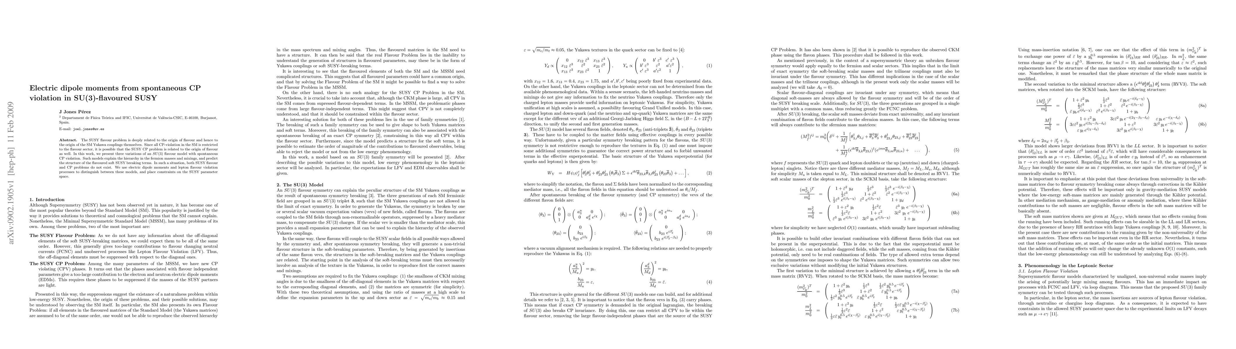 This paper explores SU(3)-flavoured SUSY models with spontaneous CP violation to address both the SUSY flavour and CP problems. It proposes three variations of such models, which predict the structure of soft SUSY breaking terms and explain the hierarchy in fermion masses and mixings, while using electric dipole moments and lepton flavour violation to distinguish between these models and constrain the SUSY parameter space.
