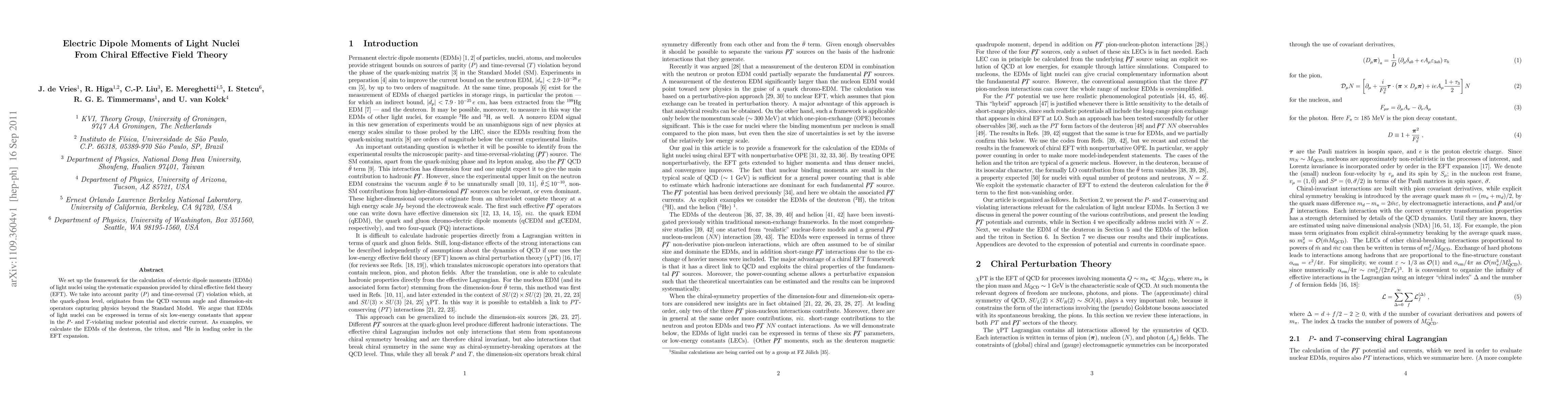 The research sets up a framework for calculating electric dipole moments (EDMs) of light nuclei using chiral effective field theory (EFT), considering parity (P) and time-reversal (T) violation from the QCD vacuum angle and dimension-six operators beyond the Standard Model. It expresses nuclear EDMs in terms of six low-energy constants in the P- and T-violating nuclear potential and electric current.