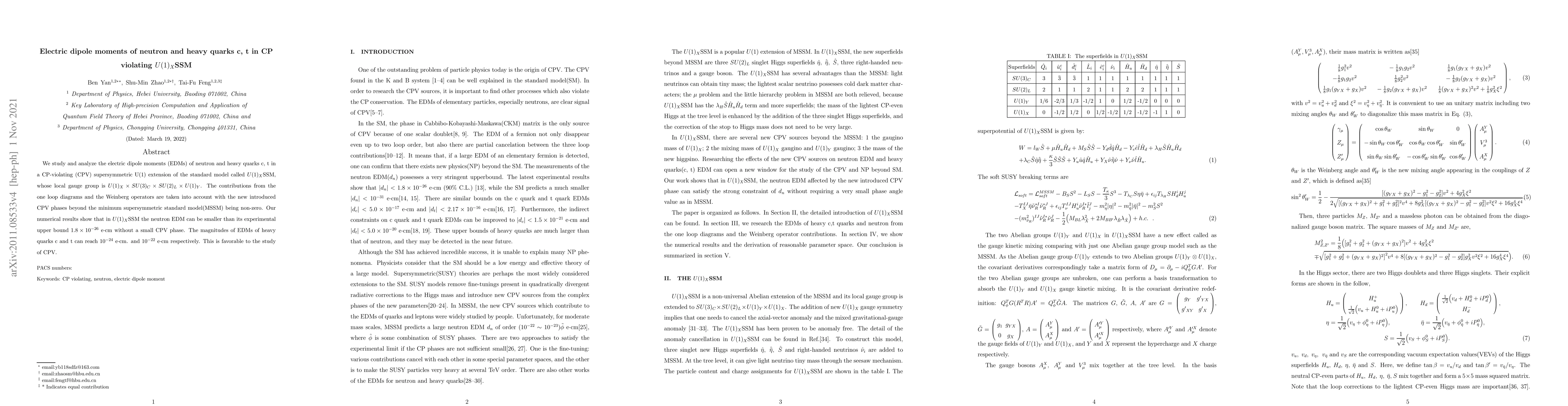 This paper investigates the electric dipole moments (EDMs) of neutron and heavy quarks c, t within a CP-violating supersymmetric U(1) extension of the standard model, $U(1)_X$SSM, revealing that the neutron EDM can remain below experimental limits without requiring a small CP-violating phase. The study also finds that the EDMs for quarks c and t can reach significant magnitudes, aiding CP violation studies.