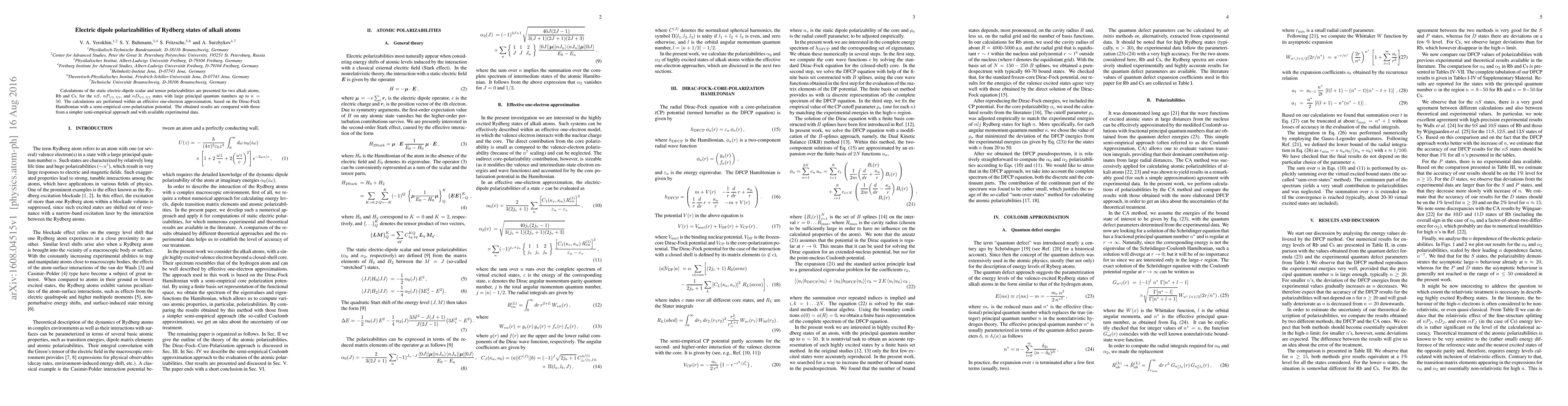 Calculations of the static electric-dipole scalar and tensor polarizabilities are presented for two alkali atoms, Rb and Cs, for the $nS$, $nP_{1/2, 3/2}$, and $nD_{3/2, 5/2}$ states with large principal quantum numbers up to $n = 50$. The calculations are performed within an effective one-electron approximation, based on the Dirac-Fock Hamiltonian with a semi-empirical core-polarization potential. The obtained results are compared with those from a simpler semi-empirical approach and with available experimental data.