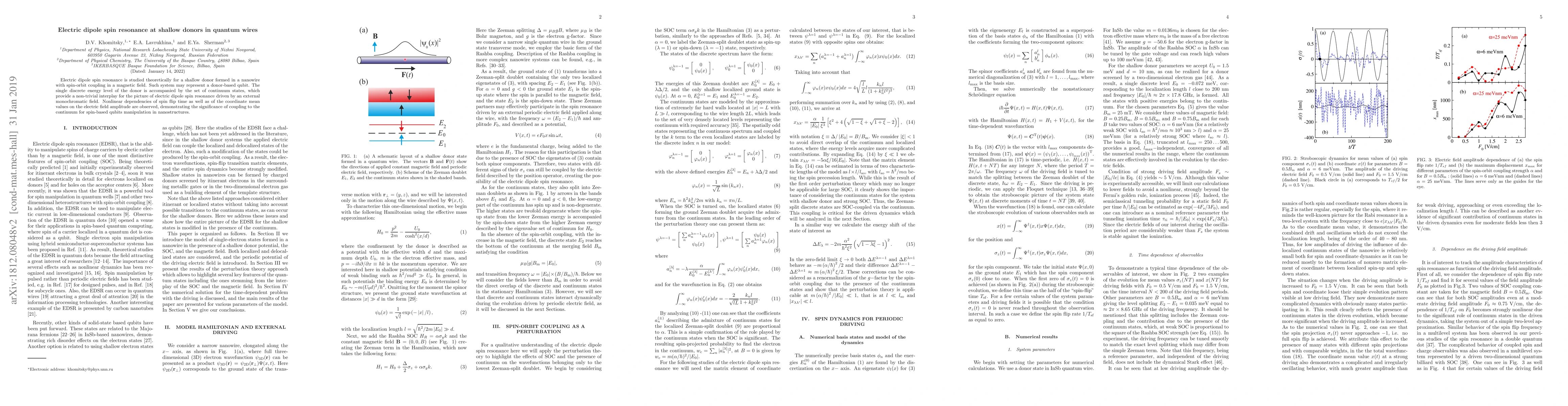 This paper explores electric dipole spin resonance in shallow donors within quantum wires, revealing complex interactions between discrete donor levels and continuum states under spin-orbit coupling and magnetic fields. The study highlights significant nonlinear effects in spin flip times and coordinate mean values, underscoring the importance of continuum coupling for manipulating spin-based qubits in nanostructures.