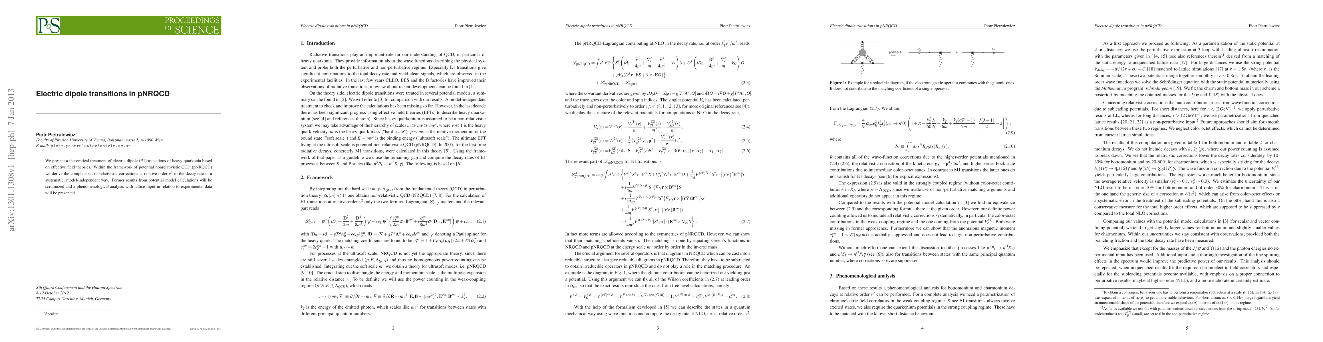 This paper provides a theoretical analysis of electric dipole transitions in heavy quarkonia using effective field theories within pNRQCD, deriving relativistic corrections at order $v^2$ and comparing results with potential model calculations and lattice data to validate experimental predictions.
