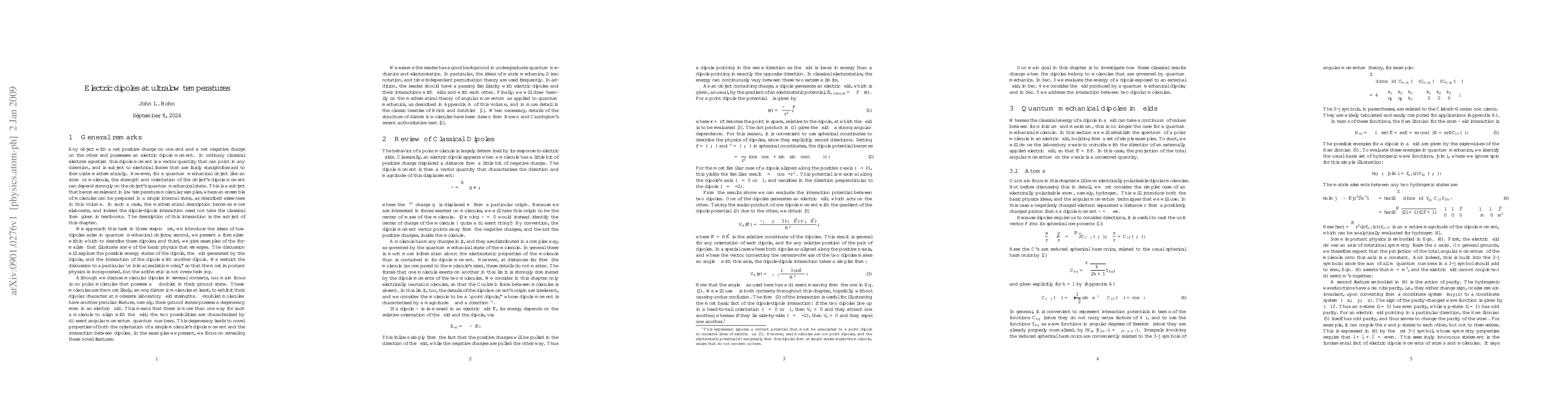 We briefly introduce the formalism for describing dipolar molecules in an ultracold gaseous environment. This treatment includes the quantum mechanical states of the dipoles, the electric fields they produce, and their interactions with one another.