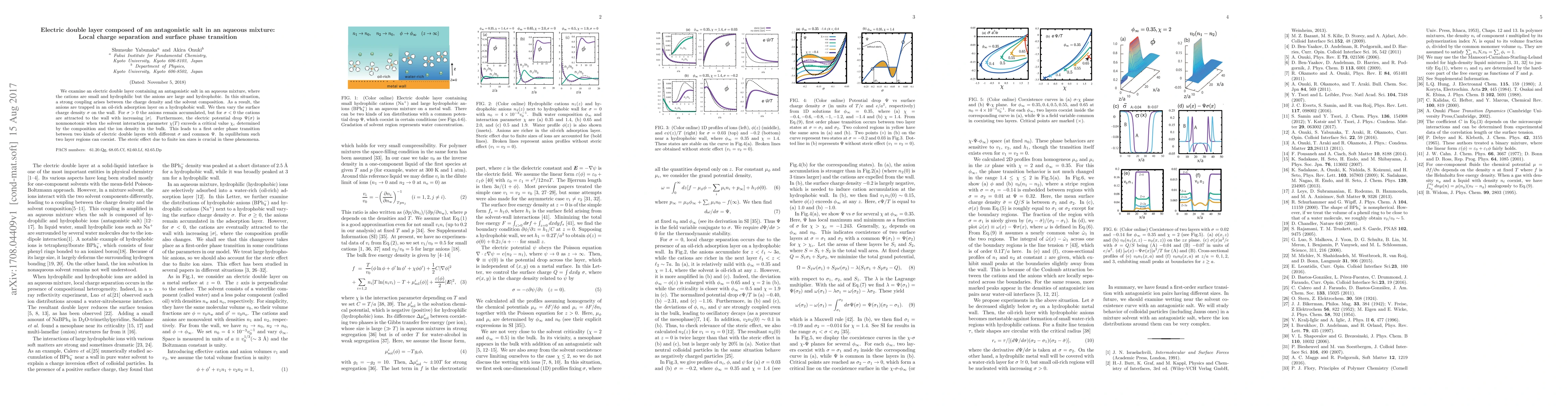 This paper investigates the behavior of an electric double layer with an antagonistic salt in an aqueous mixture, revealing a strong coupling between charge density and solvent composition. The study finds that anions are trapped in an oil-rich layer while cations are repelled, leading to a first-order phase transition and coexistence of two distinct electric double layer states depending on surface charge density.