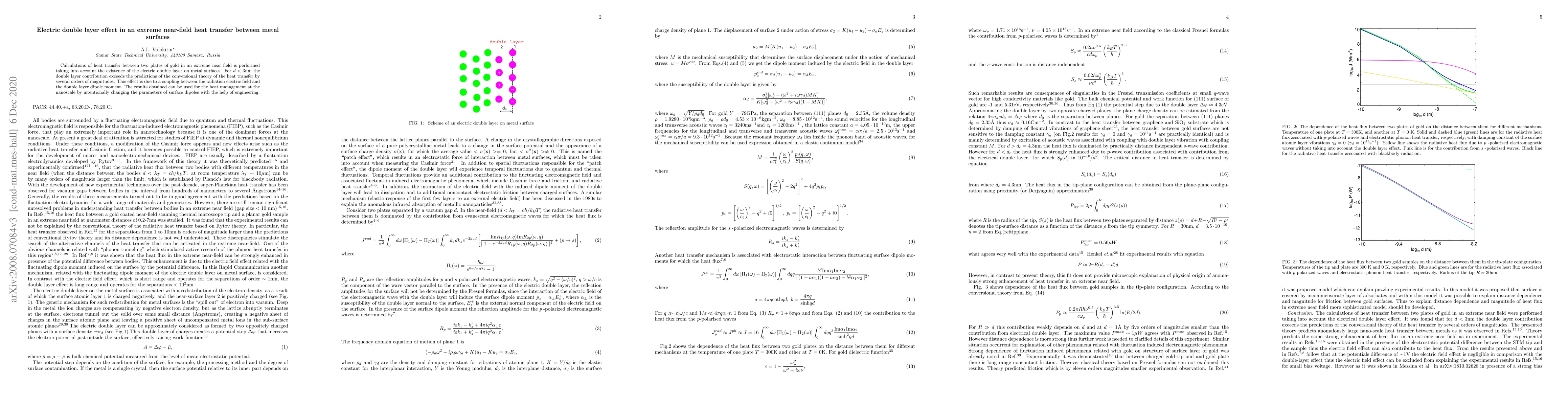 This paper investigates heat transfer between gold plates at distances less than 3nm, revealing that the electric double layer effect significantly enhances heat transfer compared to conventional theories. The coupling between the electric field and the double layer dipole moment is identified as the primary cause, offering potential for nanoscale heat management through surface engineering.