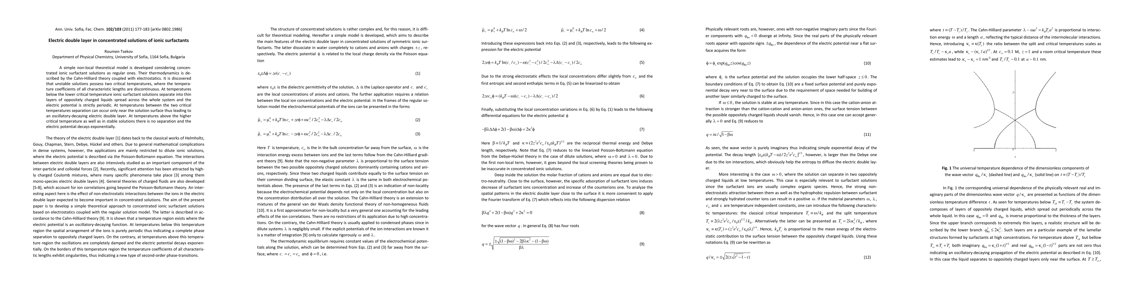 A simple non-local theoretical model is developed considering concentrated ionic surfactant solutions as regular ones. Their thermodynamics is described by the Cahn-Hilliard theory coupled with electrostatics. It is discovered that unstable solutions possess two critical temperatures, where the temperature coefficients of all characteristic lengths are discontinuous. At temperatures below the lower critical temperature ionic surfactant solutions separate into thin layers of oppositely charged liquids spread across the whole system and the electric potential is strictly periodic. At temperatures between the two critical temperatures separation can occur only near the solution surface thus leading to an oscillatory-decaying electric double layer. At temperatures above the higher critical temperature as well as in stable solutions there is no separation and the electric potential decays exponentially.