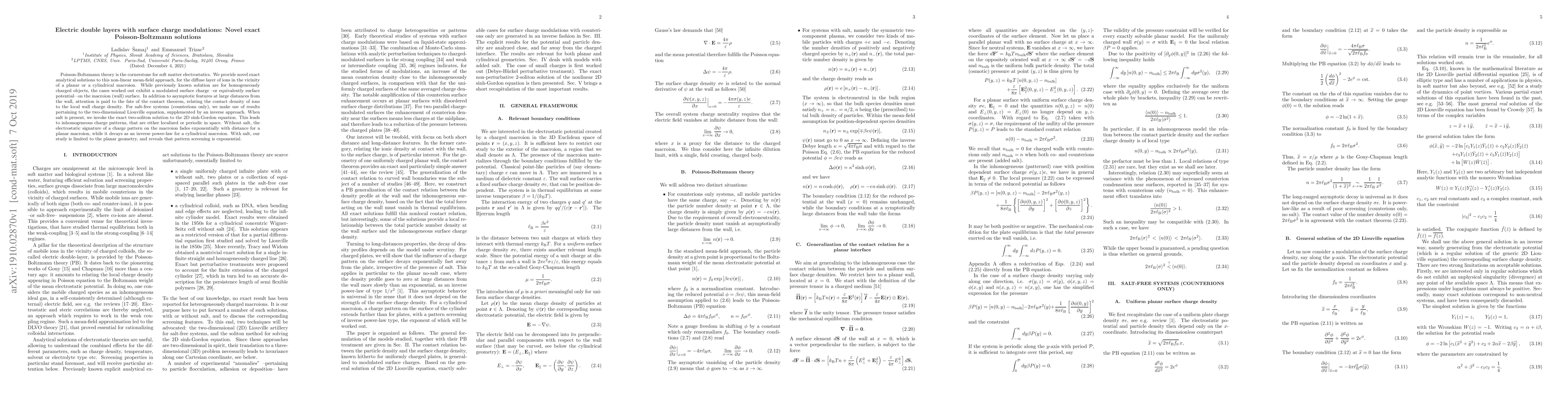 This paper presents novel exact analytical solutions to the Poisson-Boltzmann equation for electric double layers with modulated surface charges on planar or cylindrical macroions. It explores the electrostatic effects and the contact theorem in both salt-free and salt-containing systems, revealing different decay patterns and screening behaviors.