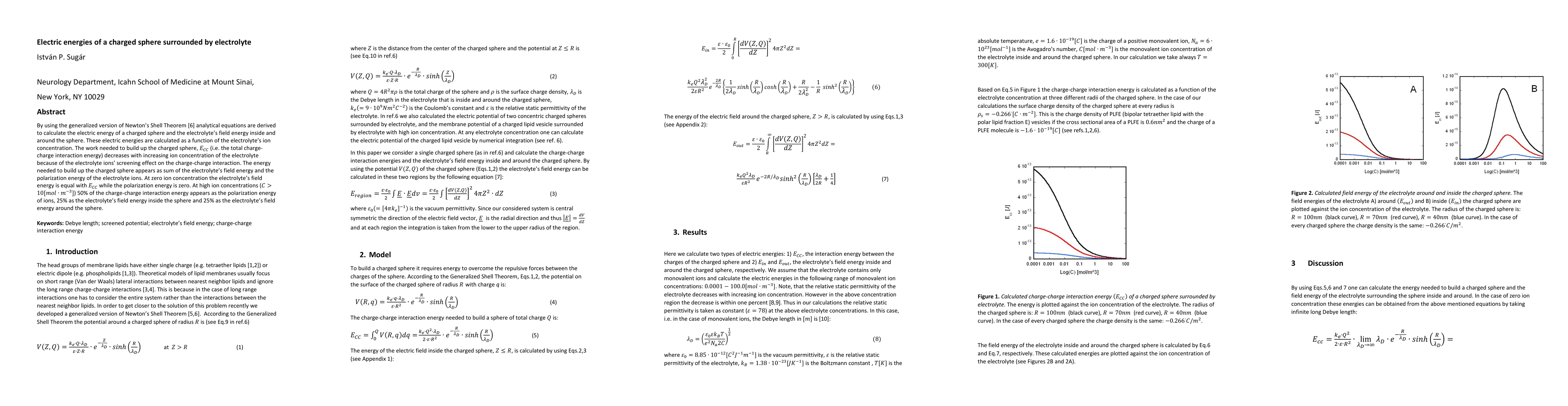 This paper derives analytical equations to calculate the electric energy of a charged sphere and its surrounding electrolyte, showing that the energy decreases with increasing ion concentration due to screening effects. The energy comprises the field energy of the electrolyte and the polarization energy of ions, with their proportions shifting with ion concentration.