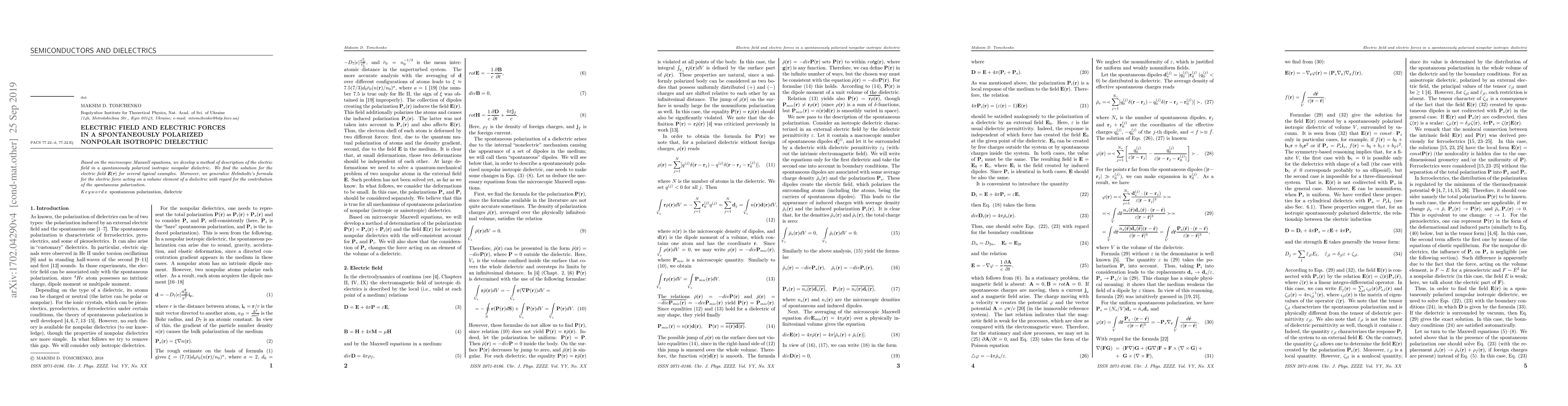 Based on the microscopic Maxwell equations, we develop a method of description of the electric field in a spontaneously polarized isotropic nonpolar dielectric. We find the solution for the electric field $\textbf{E}(\textbf{r})$ for several typical examples. Moreover, we generalize Helmholtz's formula for the electric force acting on a volume element of a dielectric with regard for the contribution of the spontaneous polarization.