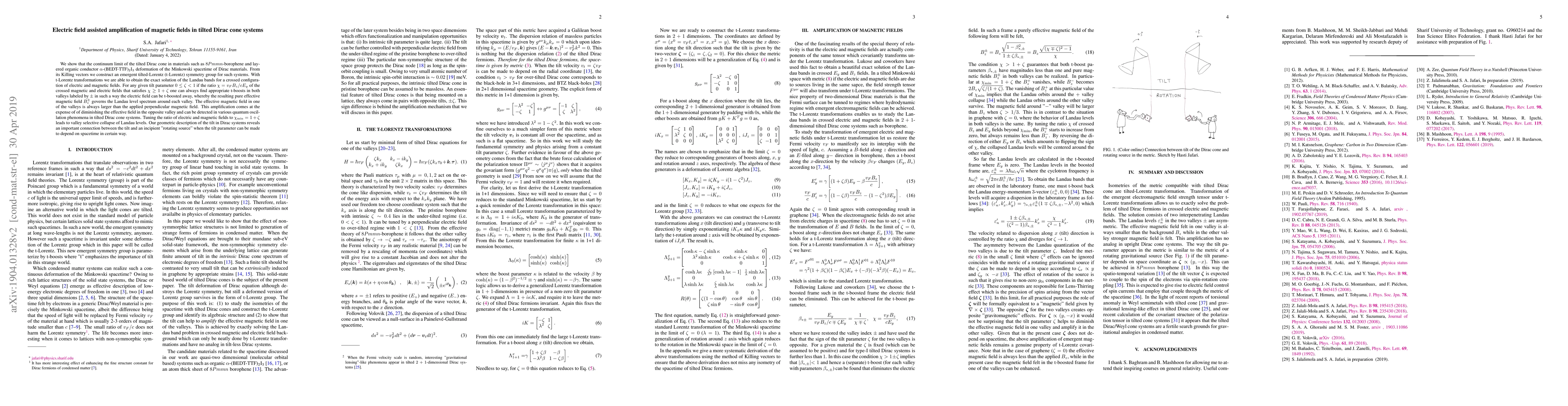 This paper demonstrates that electric fields can amplify magnetic fields in tilted Dirac cone systems, leading to enhanced effective magnetic fields detectable in quantum oscillations. The study introduces a tilted-Lorentz symmetry group to describe the deformation of Minkowski spacetime, revealing that a specific ratio of electric to magnetic fields can cause valley-selective collapse of Landau levels.