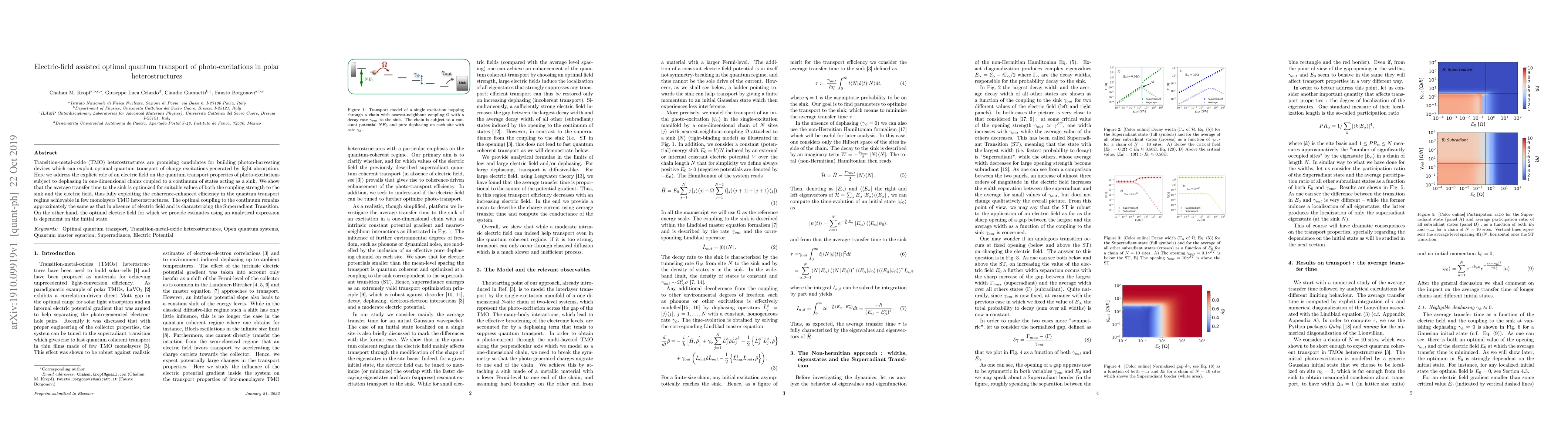 Transition-metal-oxide (TMO) heterostructures are promising candidates for building photon-harvesting devices which can exploit optimal quantum transport of charge excitations generated by light absorption. Here we address the explicit role of an electric field on the quantum transport properties of photo-excitations subject to dephasing in one-dimensional chains coupled to a continuum of states acting as a sink. We show that the average transfer time to the sink is optimized for suitable values of both the coupling strength to the sink and the electric field, thus fully exploiting the coherence-enhanced efficiency in the quantum transport regime achievable in few monolayers TMO heterostructures. The optimal coupling to the continuum remains approximately the same as that in absence of electric field and is characterizing the Superradiant Transition. On the other hand, the optimal electric field for which we provide estimates using an analytical expression is dependent on the initial state.