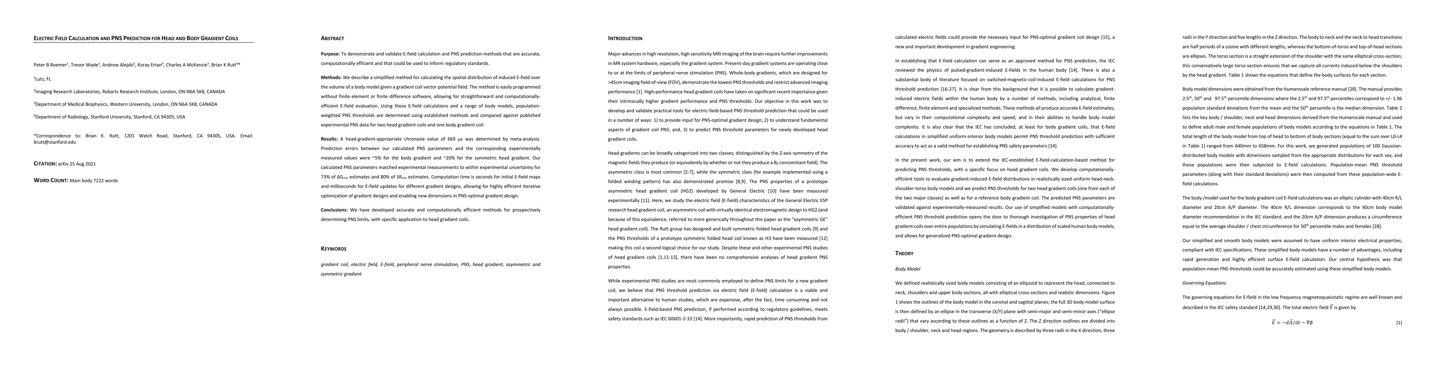 Purpose: To demonstrate and validate E-field calculation and PNS prediction methods that are accurate, computationally efficient and that could be used to inform regulatory standards. Methods: We describe a simplified method for calculating the spatial distribution of induced E-field over the volume of a body model given a gradient coil vector potential field. The method is easily programmed without finite element or finite difference software, allowing for straightforward and computationally-efficient E-field evaluation. Using these E-field calculations and a range of body models, population-weighted PNS thresholds are determined using established methods and compared against published experimental PNS data for two head gradient coils and one body gradient coil. Results: A head-gradient-appropriate chronaxie value of 669us was determined by meta-analysis. Prediction errors between our calculated PNS parameters and the corresponding experimentally measured values were ~5% for the body gradient and ~20% for the symmetric head gradient. Our calculated PNS parameters matched experimental measurements to within experimental uncertainty for 73% of deltaGmin estimates and 80% of SRmin estimates. Computation time is seconds for initial E-field maps and milliseconds for E-field updates for different gradient designs, allowing for highly efficient iterative optimization of gradient designs and enabling new dimensions in PNS-optimal gradient design. Conclusions: We have developed accurate and computationally efficient methods for prospectively determining PNS limits, with specific application to head gradient coils.