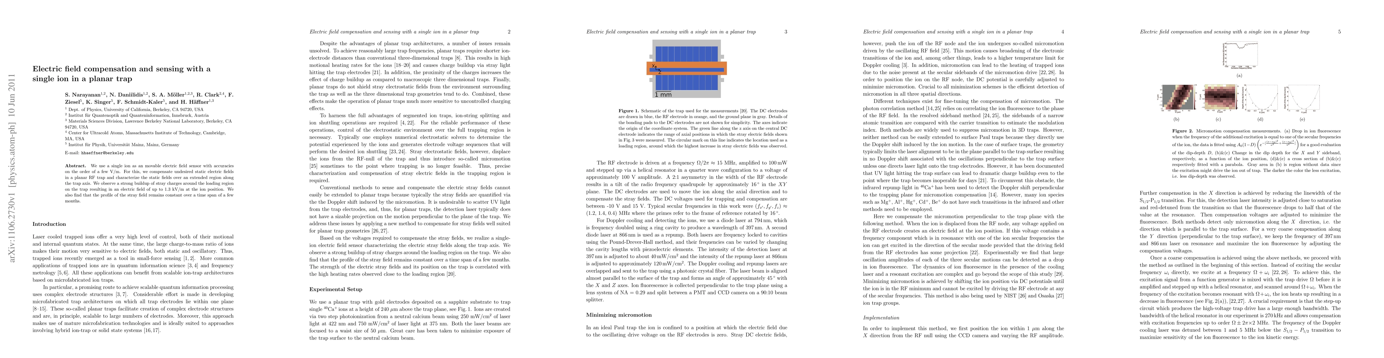 This research employs a single ion in a planar RF trap to accurately sense electric fields with accuracies of a few V/m. The study compensates for static electric fields and observes a stable stray field buildup of up to 1.3 kV/m around the trap's loading region over several months.