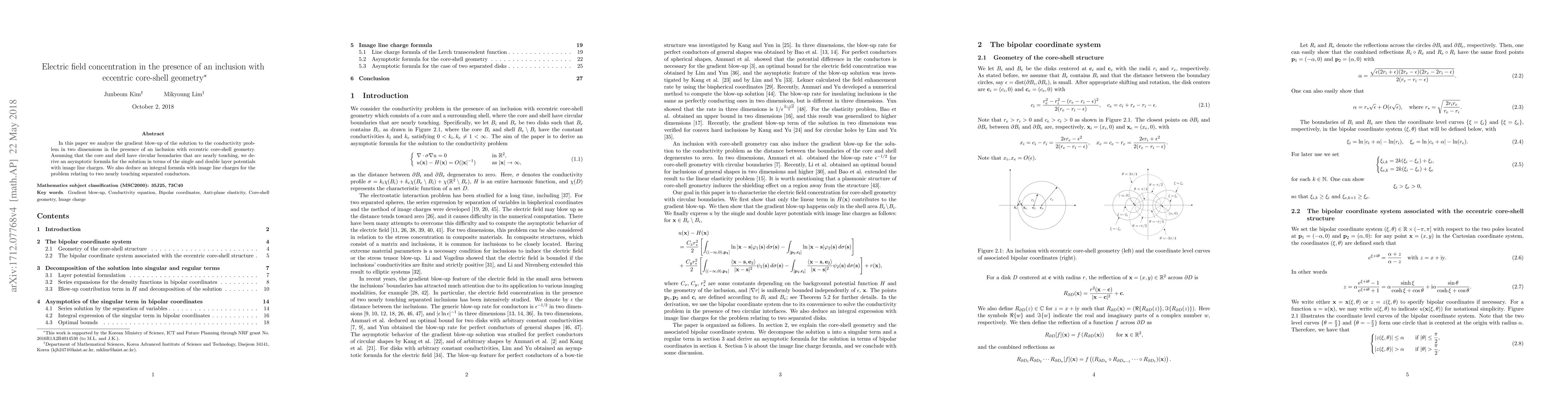 This paper investigates the electric field concentration around an inclusion with eccentric core-shell geometry, deriving an asymptotic formula for the solution using single and double layer potentials with image line charges, and providing an integral formula for nearly touching separated conductors.