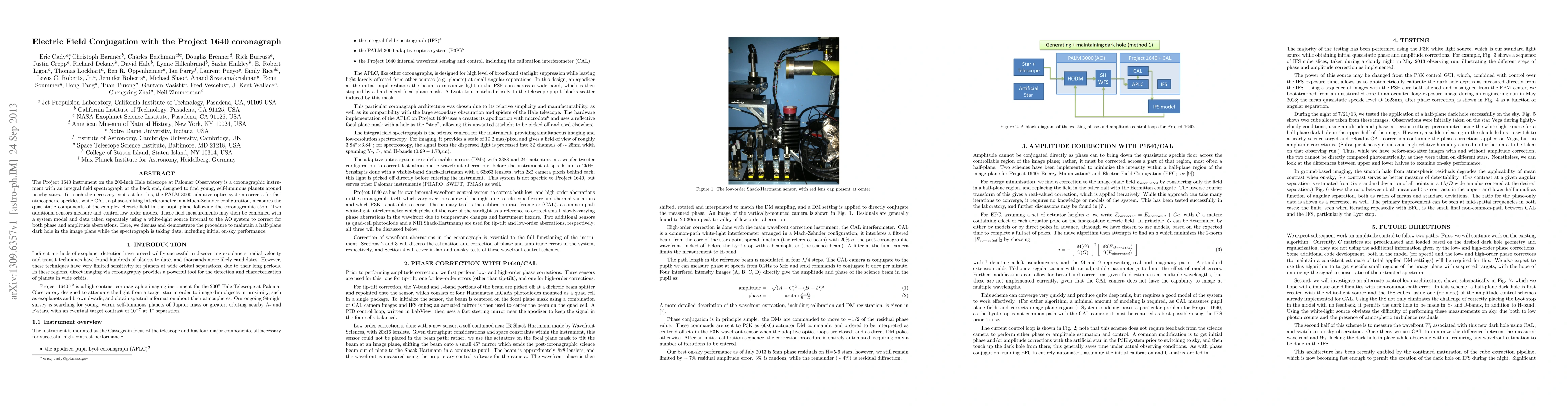 The Project 1640 instrument on the 200-inch Hale telescope at Palomar Observatory is a coronagraphic instrument with an integral field spectrograph at the back end, designed to find young, self-luminous planets around nearby stars. To reach the necessary contrast for this, the PALM-3000 adaptive optics system corrects for fast atmospheric speckles, while CAL, a phase-shifting interferometer in a Mach-Zehnder configuration, measures the quasistatic components of the complex electric field in the pupil plane following the coronagraphic stop. Two additional sensors measure and control low-order modes. These field measurements may then be combined with a system model and data taken separately using a white-light source internal to the AO system to correct for both phase and amplitude aberrations. Here, we discuss and demonstrate the procedure to maintain a half-plane dark hole in the image plane while the spectrograph is taking data, including initial on-sky performance.