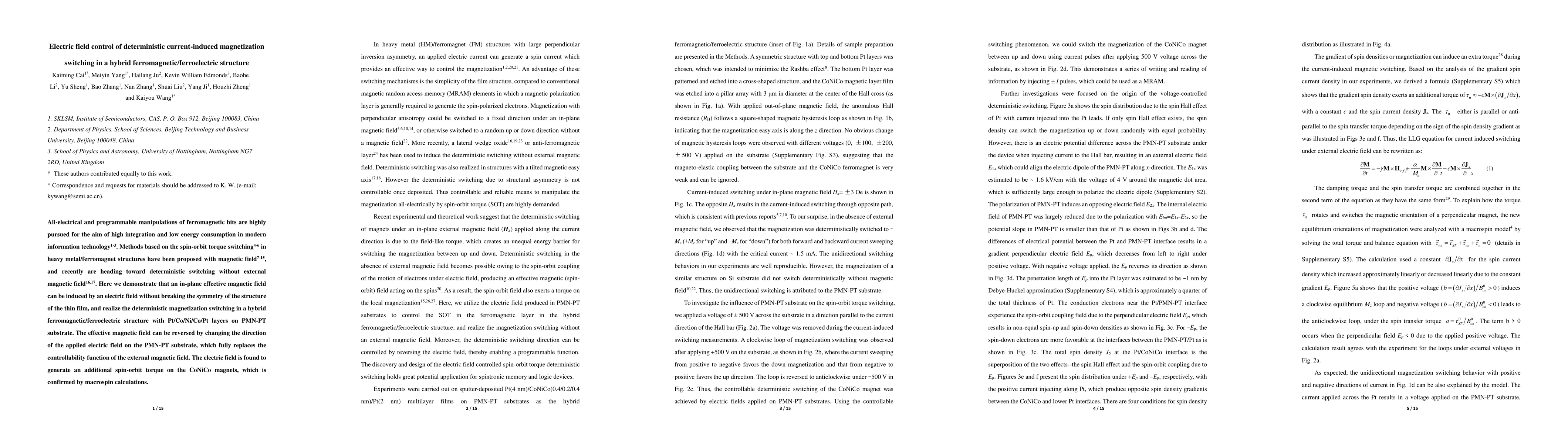 This paper demonstrates deterministic magnetization switching in a hybrid ferromagnetic/ferroelectric structure using an electric field, replacing the need for an external magnetic field. The electric field induces an effective magnetic field through spin-orbit torque, enabling control over the magnetization without breaking the structure's symmetry.